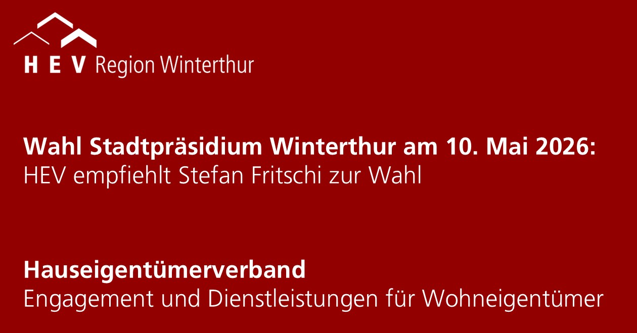 Der Vorstand des Hauseigentümerverbands Region Winterthur empfiehlt einstimmig sein Mitglied Stadtrat Stefan Fritschi zur Wahl als Stadtpräsident von Winterthur.