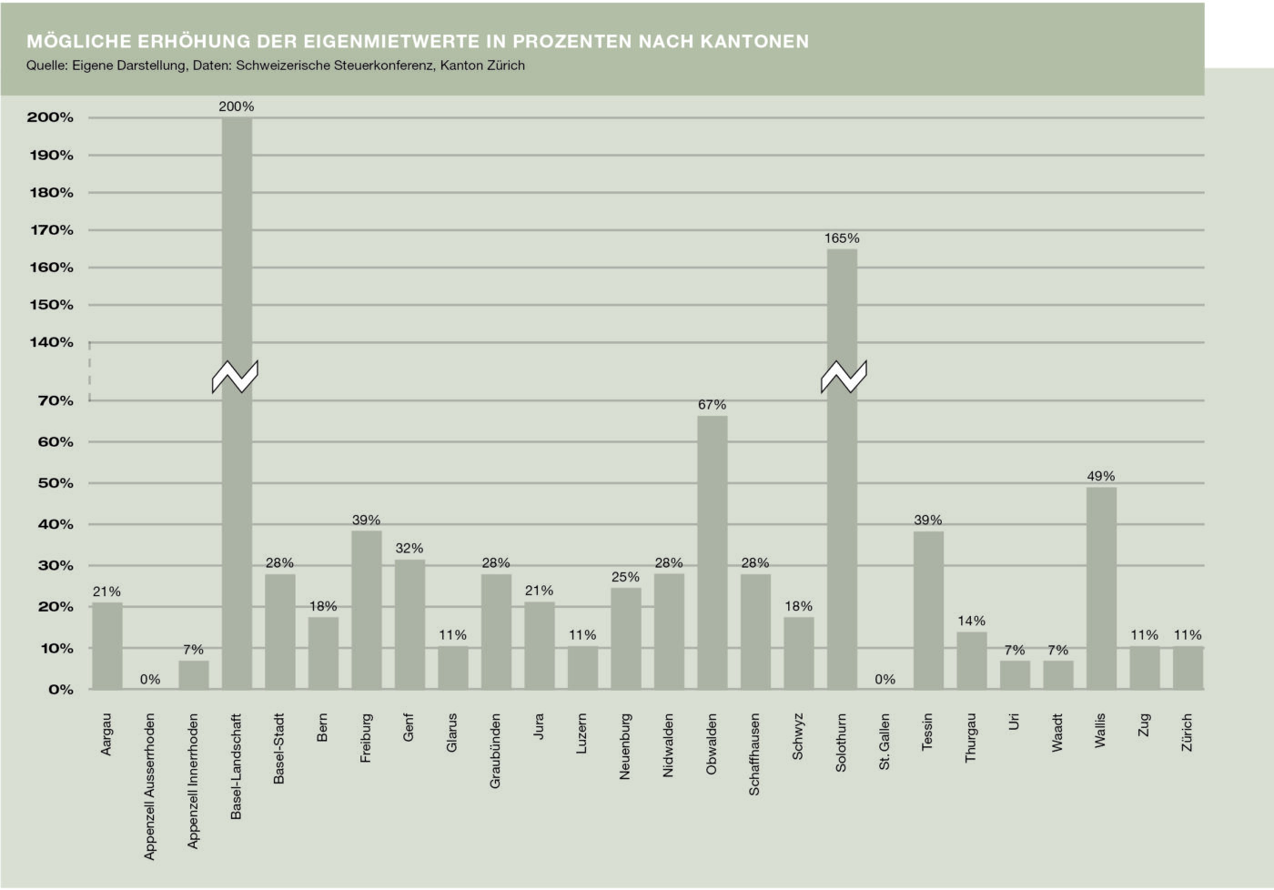 Nimmt man die Repartitionswerte der Schweizer Steuerkonferenz sowie die Neubewertungen im Kanton Zürich als Grundlage, erhöhen sich die Eigenmietwerte schweizweit um durchschnittlich 34%. Die Unterschiede in den einzelnen Kantonen sind allerdings sehr gross. Während die Eigenmietwerte in Basel-Landschaft und Solothurn stark steigen würden, gäbe es in Appenzell Ausserrhoden und St. Gallen keine Erhöhung.