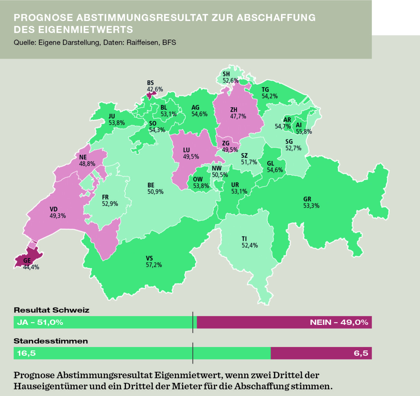 Überträgt man diese Resultate auf die Abstimmung zur Abschaffung des Eigenmietwerts, und geht man davon aus, dass zwei Drittel der Hauseigentümer und ein Drittel der Mieter für die Abschaffung stimmen, wird der Eigenmietwert mit 51% und einem Ständemehr von 16,5 zu 6,5 abgeschafft.
