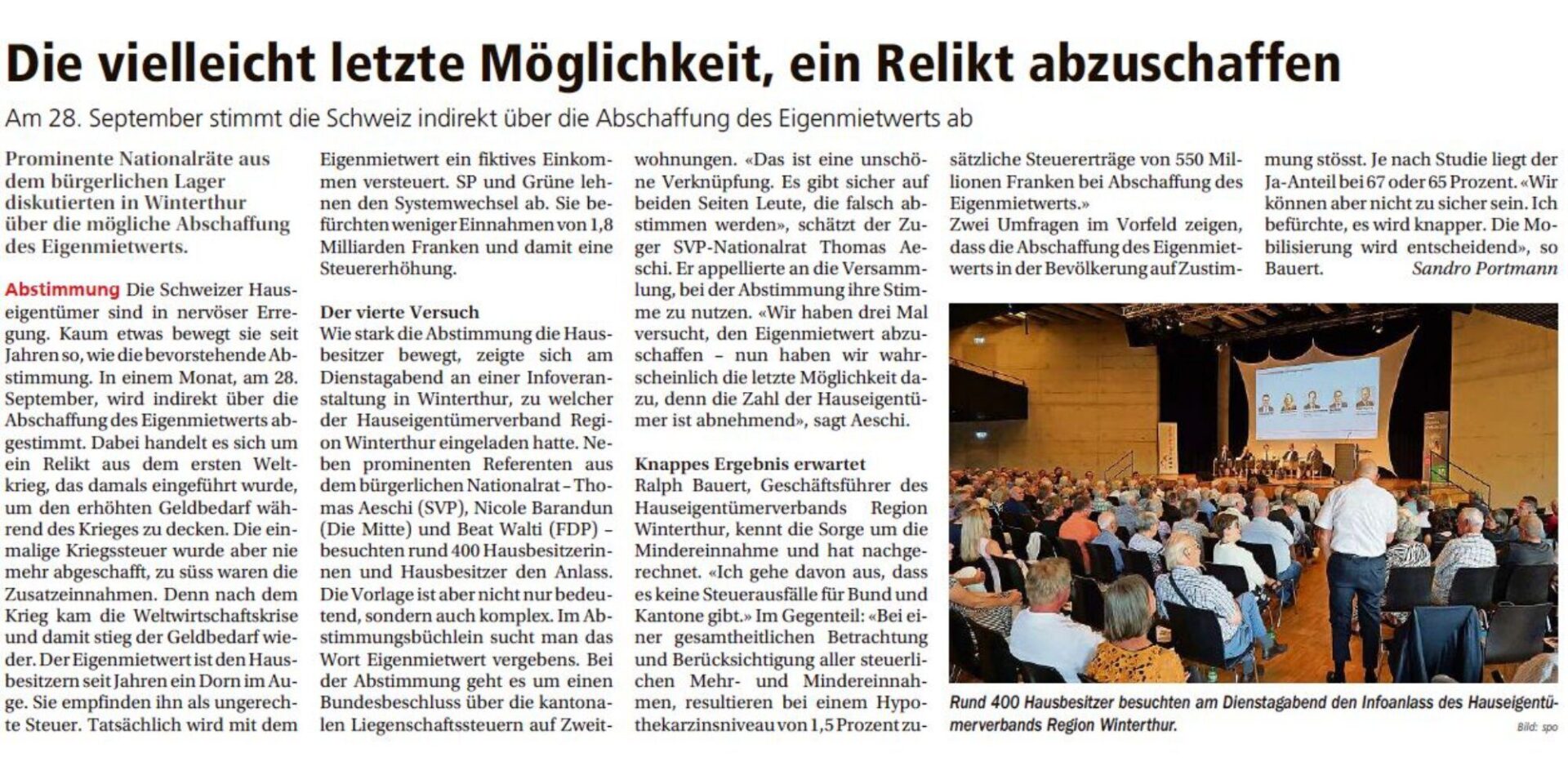 Die Winterthurer Zeitung berichtet in der Ausgabe vom 21. August 2025 über die Veranstaltung "Abschaffung des Eigenmietwerts", welche am 19. August 2025 vom Hauseigentümerverband Region Winterthur durchgeführt wurde. Weitere Informationen und Grafiken zum Eigenmietwert in diesem Online-Artikel von HEV-Geschäftsführer Ralph Bauert: Fakten zur Abschaffung des Eigenmietwerts
