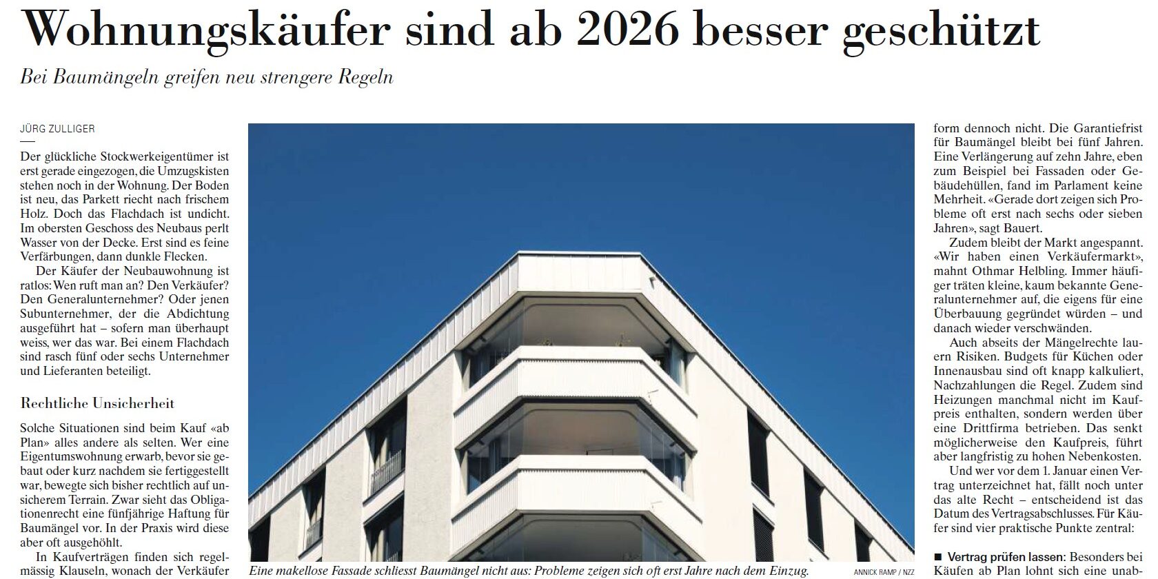 Die Neue Zürcher Zeitung NZZ informiert in der Ausgabe vom 30. Dezember 2025 über die Gesetzesanpassungen bei Baumängeln. Der Anstoss zu diesen Gesetzesänderungen kam vom Hauseigentümerverband Region Winterthur, nachdem HEV-Geschäftsführer Ralph Bauert an der Baurechtstagung 2009 über die Problematik der Mängelabtretung beim Kauf von neugebauten Eigentumswohnungen aufmerksam wurde.