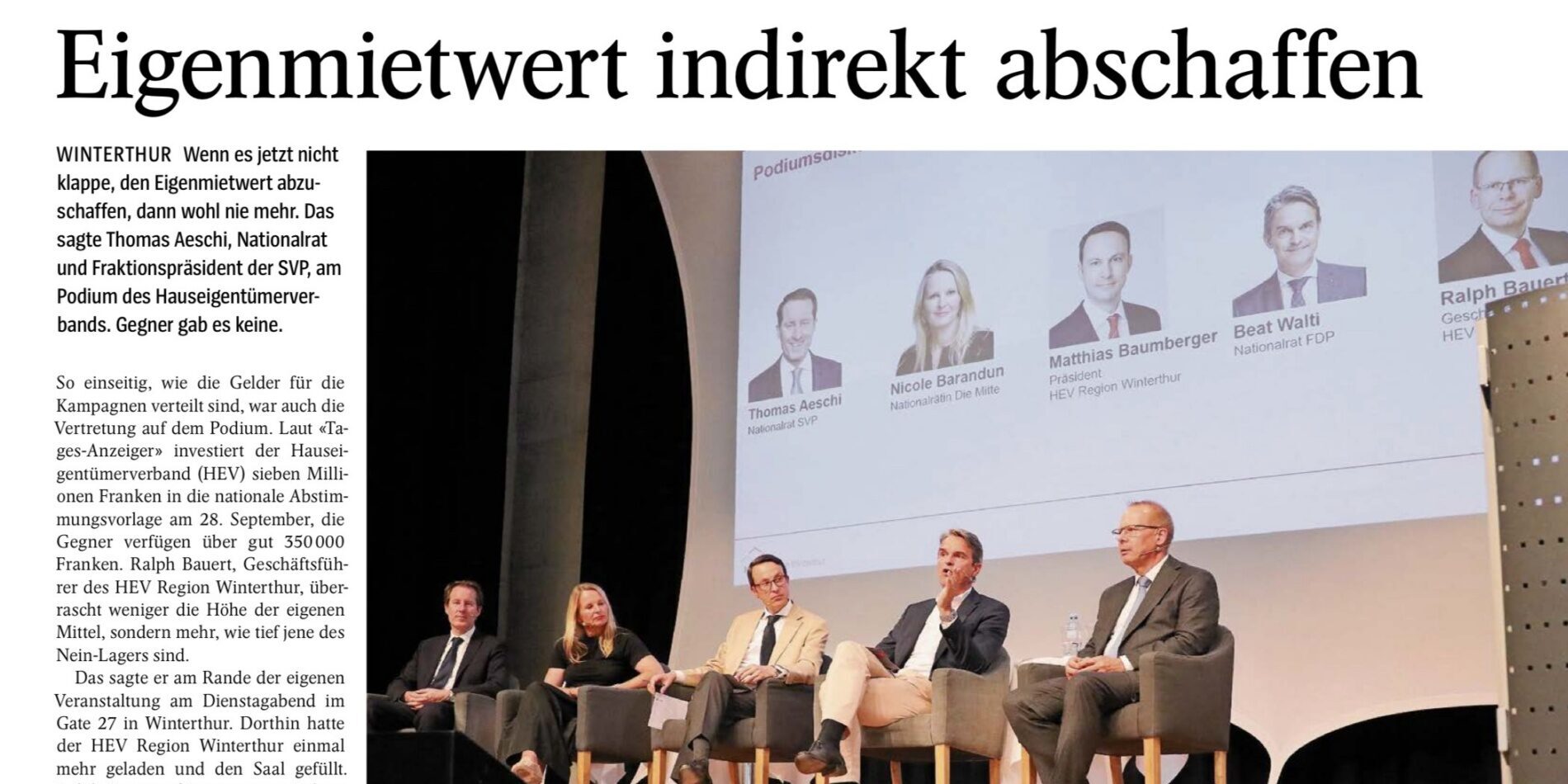Die Andelfinger Zeitung berichtet in der Ausgabe vom 22. August 2025 über die Veranstaltung "Abschaffung des Eigenmietwerts", welche am 19. August 2025 vom Hauseigentümerverband Region Winterthur durchgeführt wurde. Weitere Informationen und Grafiken zum Eigenmietwert in diesem Online-Artikel von HEV-Geschäftsführer Ralph Bauert: Fakten zur Abschaffung des Eigenmietwerts
