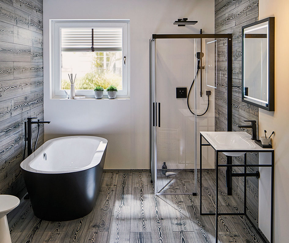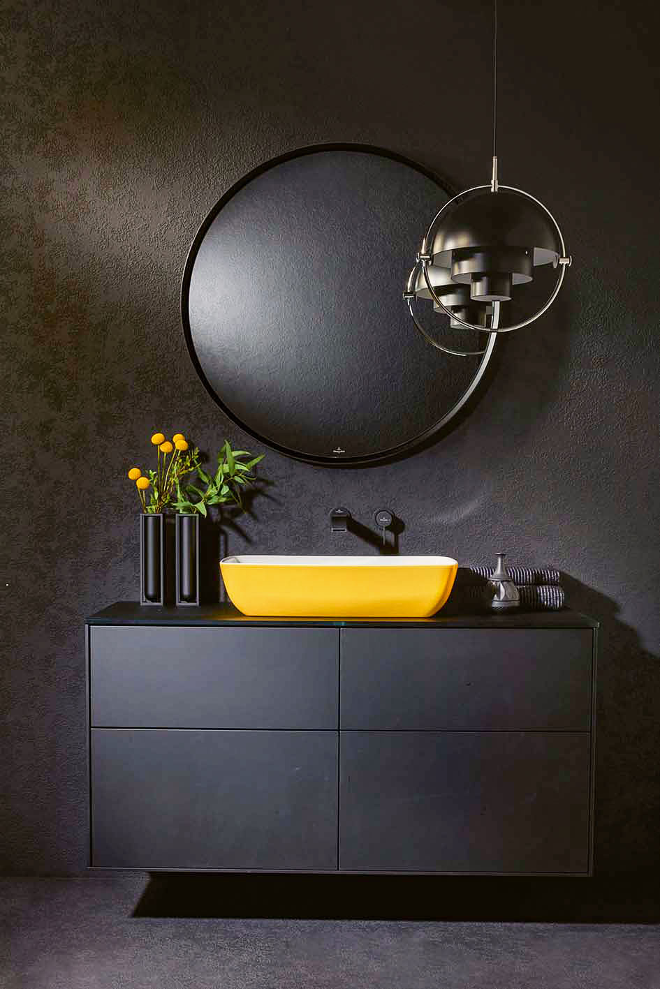 Schwarz statt Weiss – auch damit kann man eigentlich nichts falsch machen. Im Gegenteil: Schwarze Keramiken, schwarze Badmöbel und Plättli wirken elegant, glamourös und auch wahnsinnig cool. Mutige Farbtupfer setzt man mit Accessoires oder einem gelben Waschbecken. Auch wer auf Industriecharme steht, kommt um Schwarz nicht herum und macht vor allem Profile und Stützstangen sichtbar. Dazu passend: eine Schwarze Badewanne und Armaturen in mattem Schwarz.