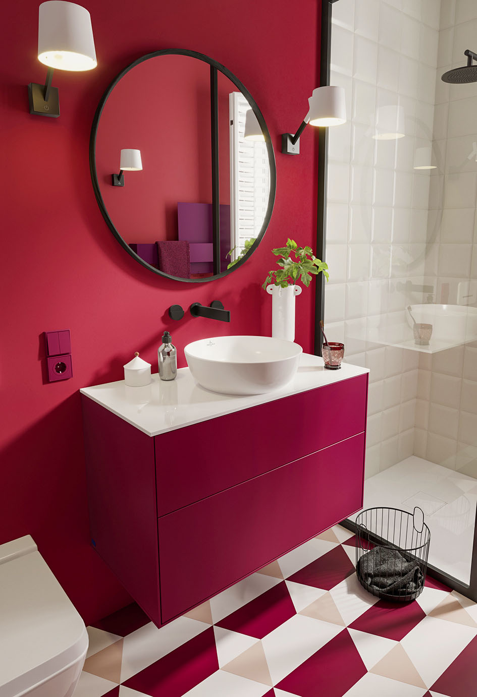 Wer sich im Familienbad noch nicht an die ganz grossen Farben traut, nutzt vielleicht in einem ersten Schritt das Gästebad als Spielwiese für mehr Farbe. Hier hinterlässt zum Beispiel die Artis-Linie von Villeroy Boch mit einem satten Bordeaux einen bleibenden Eindruck und macht aus dem oft unterschätzten Raum eine repräsentative Visitenkarte für das ganze Zuhause.