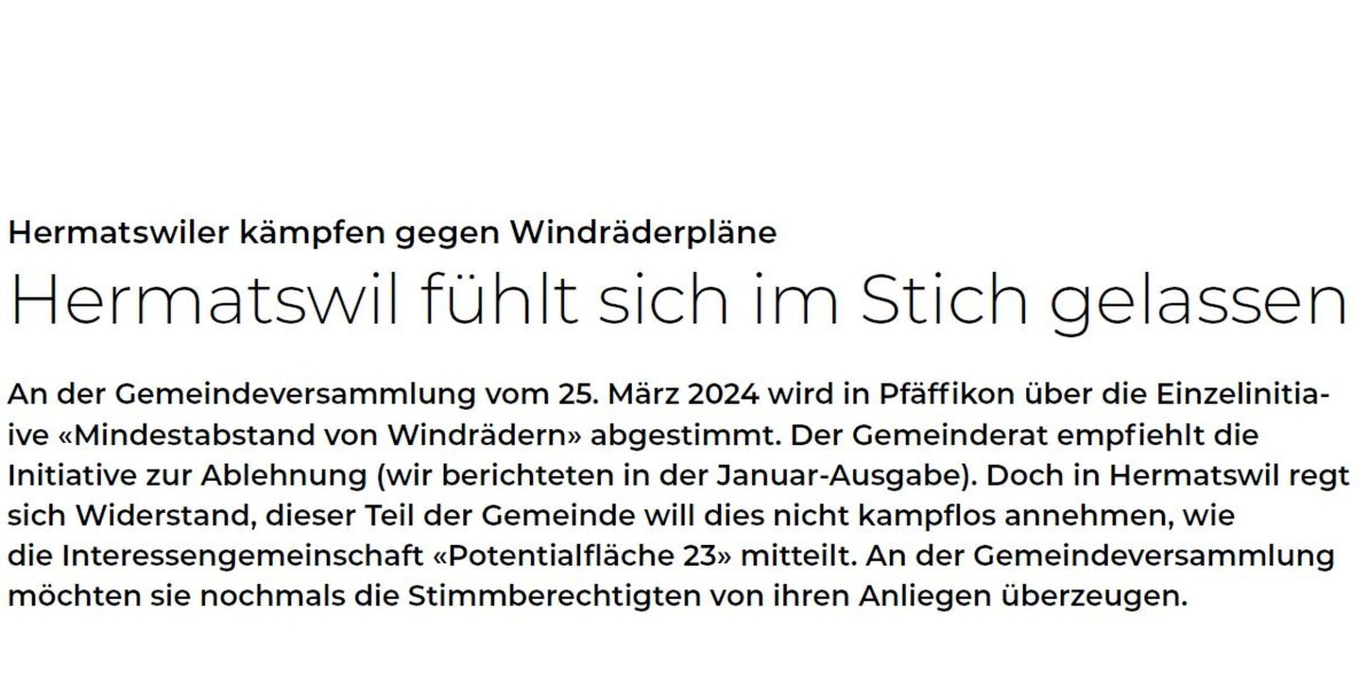An der Gemeindeversammlung vom 25. März 2024 wird in Pfäffikon über die Einzelinitiaive «Mindestabstand von Windrädern» abgestimmt. Der Gemeinderat empfiehlt die Initiative zur Ablehnung (wir berichteten in der Januar-Ausgabe). Doch in Hermatswil regt sich Widerstand, dieser Teil der Gemeinde will dies nicht kampflos annehmen, wie die Interessengemeinschaft «Potentialfläche 23» mitteilt. An der Gemeindeversammlung möchten sie nochmals die Stimmberechtigten von ihren Anliegen überzeugen.