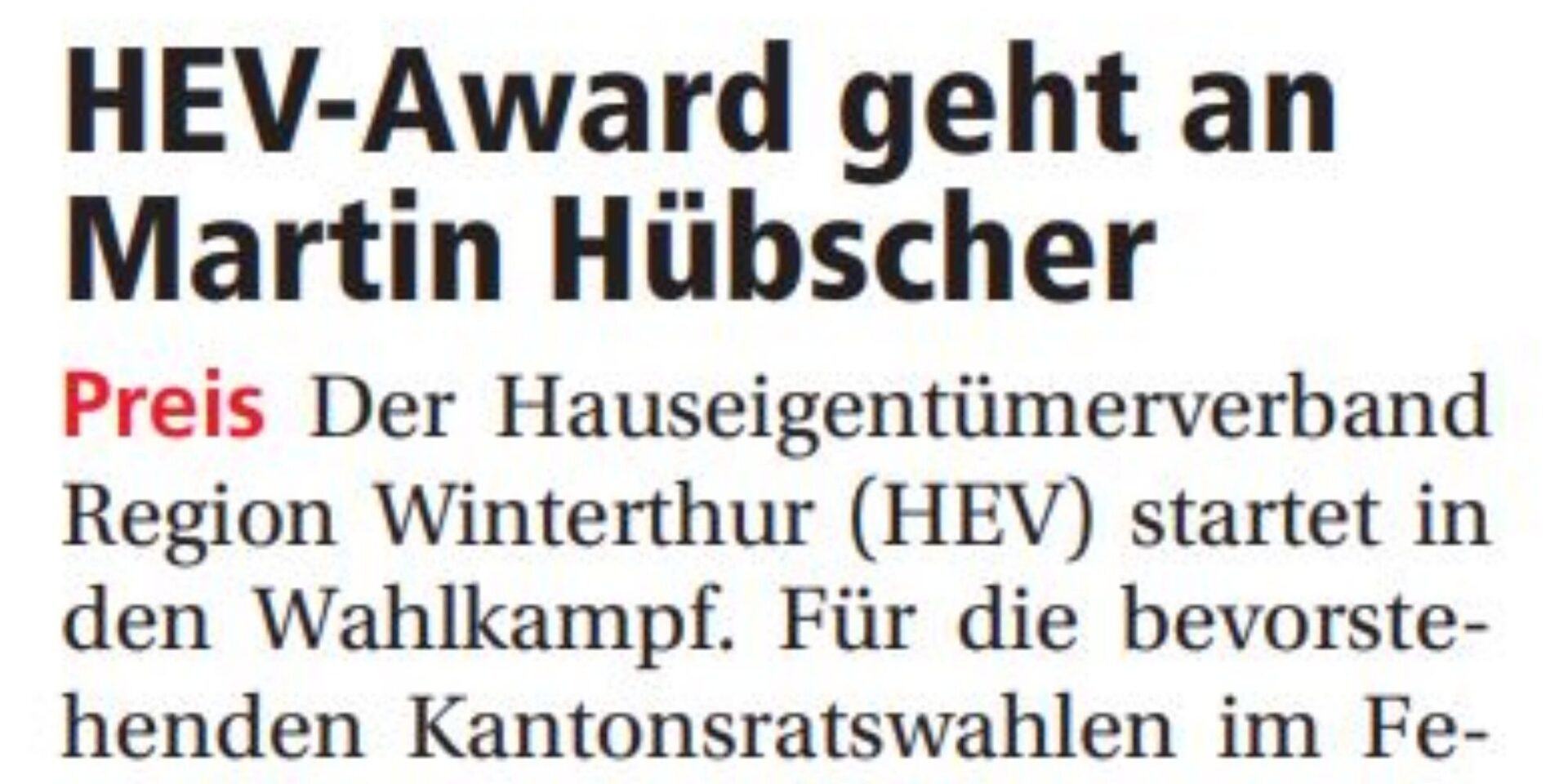 Die Winterthurer Zeitung berichtet in der Ausgabe vom 24. November 2022 über die Vergabe des HEV-Award vom HEV Region Winterthur.