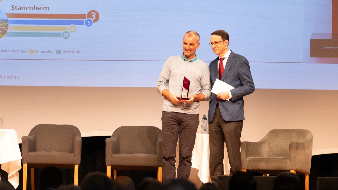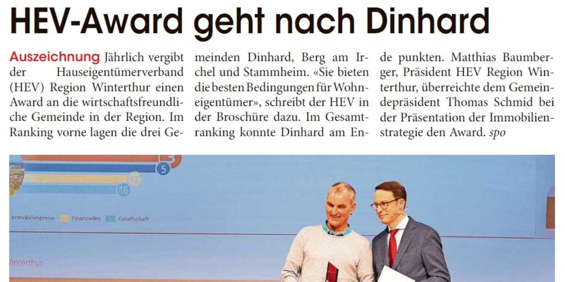 Jährlich vergibt der Hauseigentümerverband (HEV) Region Winterthur einen Award an die wirtschaftsfreundliche Gemeinde in der Region. Im Ranking vorne lagen die drei Gemeinden Dinhard, Berg am Irchel und Stammheim. «Sie bieten die besten Bedingungen für Wohneigentümer», schreibt der HEV in der Broschüre dazu. Im Gesamtranking konnte Dinhard am Ende punkten. Matthias Baumberger, Präsident HEV Region Winterthur, überreichte dem Gemeindepräsident Thomas Schmid bei der Präsentation der Immobilienstudie den Award.
