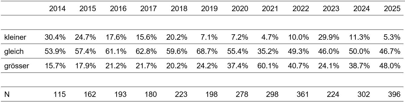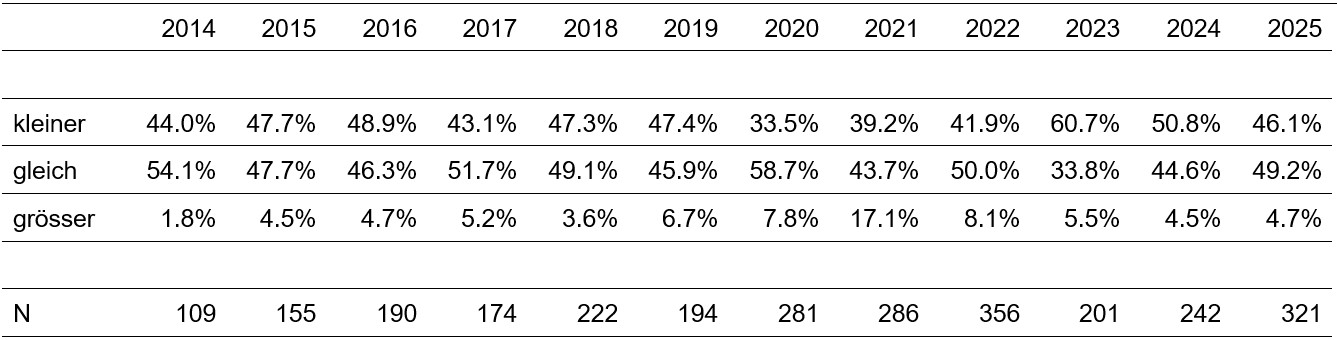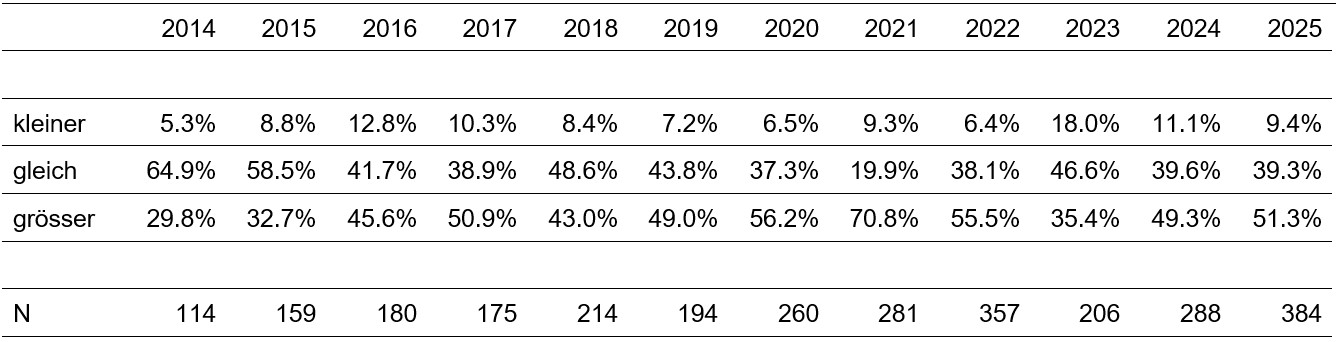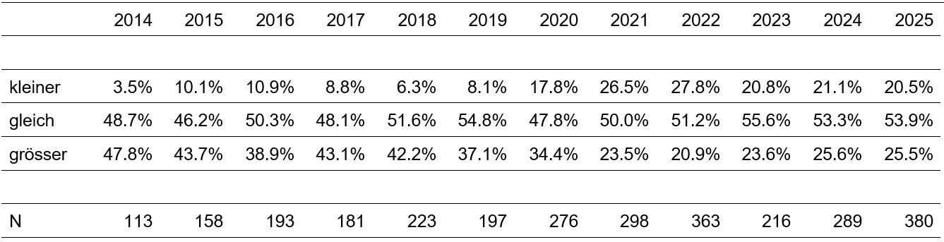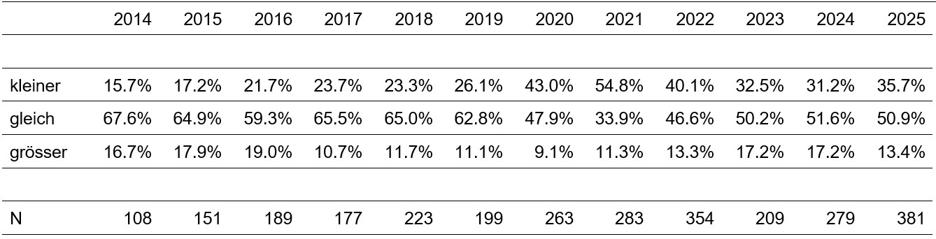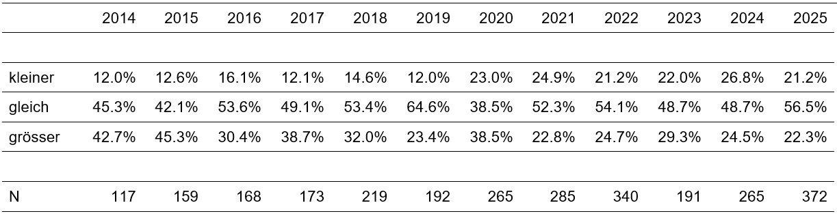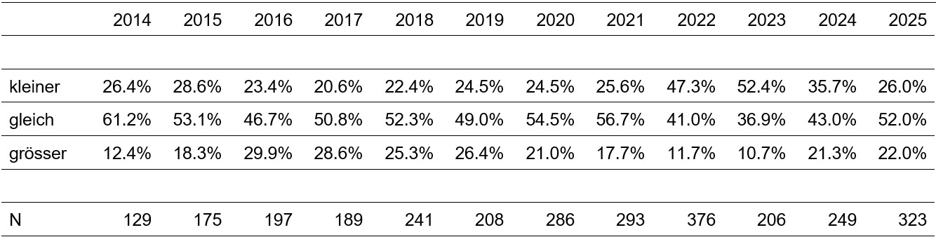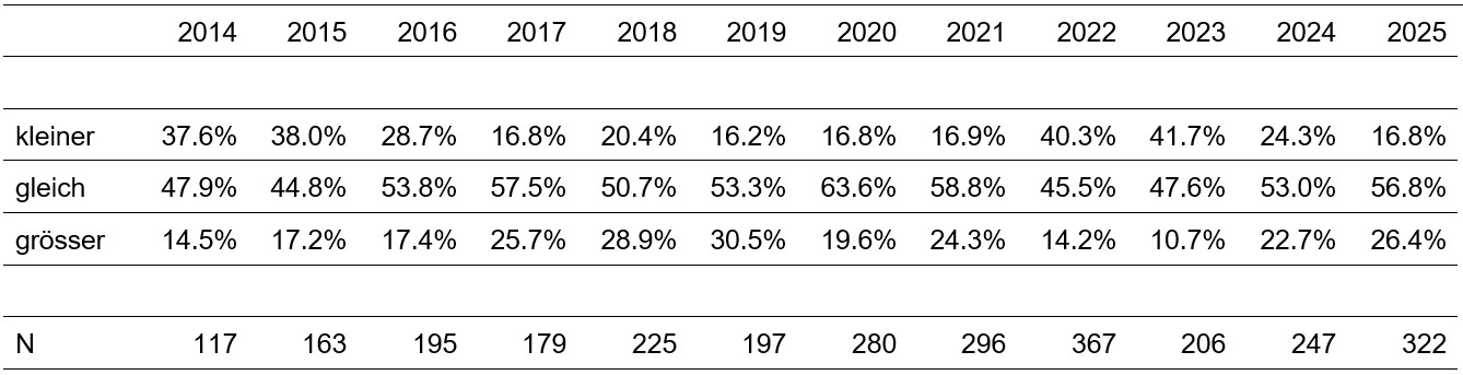 Obwohl die Nachfrage nach Wohnraum weiterhin hoch ist, erwarten die meisten Experten auch im Jahr 2026 eine gleichbleibende oder sogar rückläufige Neubautätigkeit. Bei Einfamilienhäusern prognostizieren 46,1 Prozent der Experten eine kleinere und 49,2 Prozent eine gleichbleibende Neubautätigkeit. Bei Eigentumswohnungen wird eine leicht höhere Neubautätigkeit erwartet. Nur 16,8 Prozent erwarten einen Rückgang der Neubautätigkeit, 56,8 Prozent eine gleichbleibende und 26,4 Prozent eine grössere Neubautätigkeit als im Jahr 2025. Bei Mehrfamilienhäusern rechnet rund die Hälfte der Experten mit einer gleichbleibenden Neubautätigkeit und je ein Viertel mit einer kleineren bzw. grösseren Neubautätigkeit. Vorsichtiger wird die Neubautätigkeit bei Büro- und Geschäftshäusern eingeschätzt, 67,4 Prozent erwarten eine kleinere, 30,4 Prozent eine gleichbleibende und nur 2,2 Prozent eine grössere Neubautätigkeit bei Büro- und Geschäftsliegenschaften.