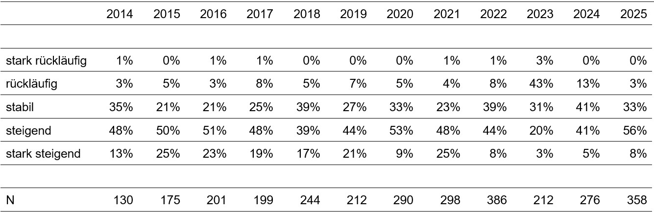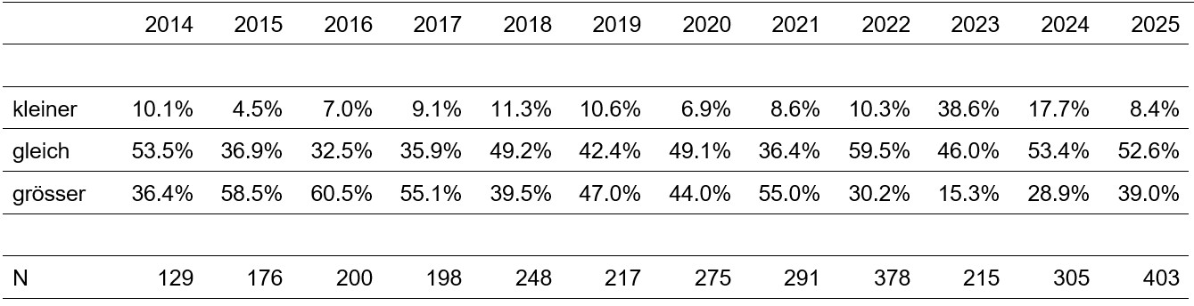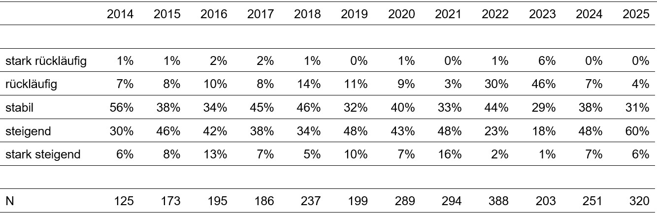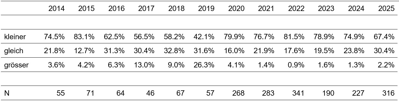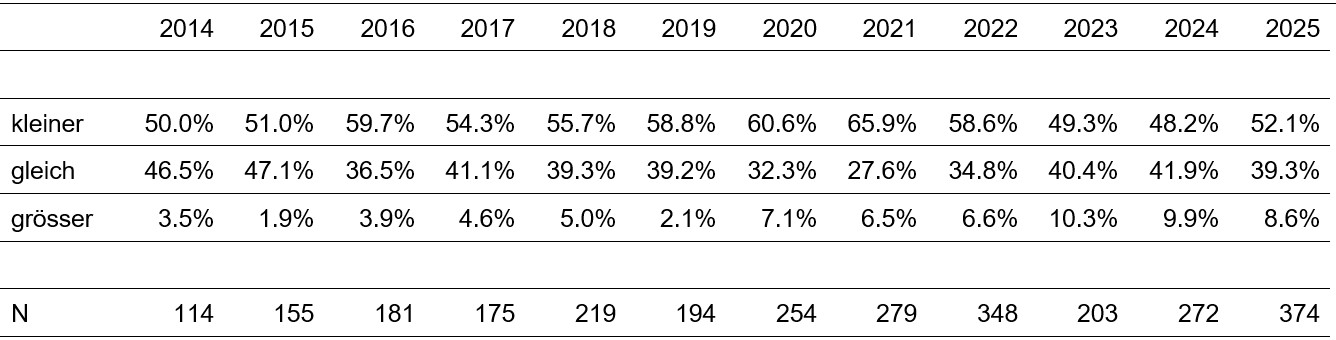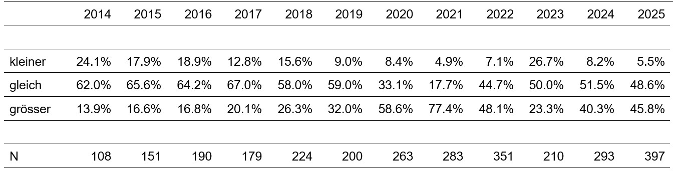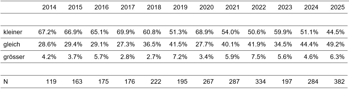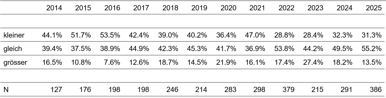 Obwohl die Nachfrage nach Wohnraum weiterhin hoch ist, erwarten die meisten Experten auch im Jahr 2026 eine gleichbleibende oder sogar rückläufige Neubautätigkeit. Bei Einfamilienhäusern prognostizieren 46,1 Prozent der Experten eine kleinere und 49,2 Prozent eine gleichbleibende Neubautätigkeit. Bei Eigentumswohnungen wird eine leicht höhere Neubautätigkeit erwartet. Nur 16,8 Prozent erwarten einen Rückgang der Neubautätigkeit, 56,8 Prozent eine gleichbleibende und 26,4 Prozent eine grössere Neubautätigkeit als im Jahr 2025. Bei Mehrfamilienhäusern rechnet rund die Hälfte der Experten mit einer gleichbleibenden Neubautätigkeit und je ein Viertel mit einer kleineren bzw. grösseren Neubautätigkeit. Vorsichtiger wird die Neubautätigkeit bei Büro- und Geschäftshäusern eingeschätzt, 67,4 Prozent erwarten eine kleinere, 30,4 Prozent eine gleichbleibende und nur 2,2 Prozent eine grössere Neubautätigkeit bei Büro- und Geschäftsliegenschaften.