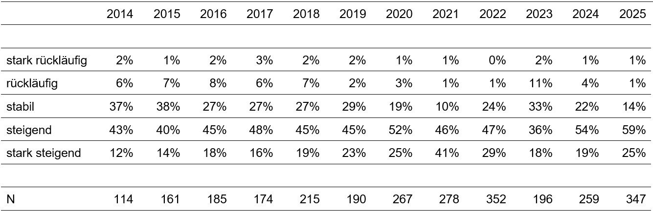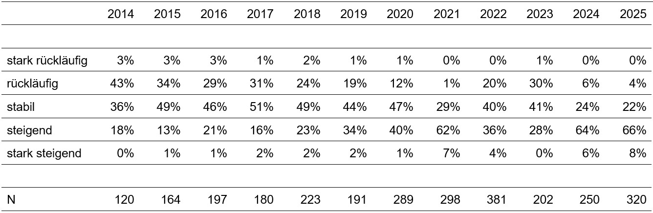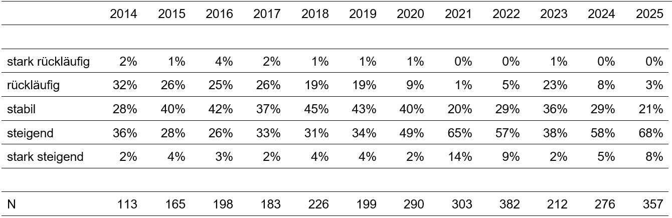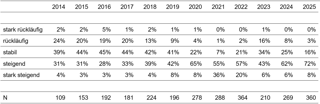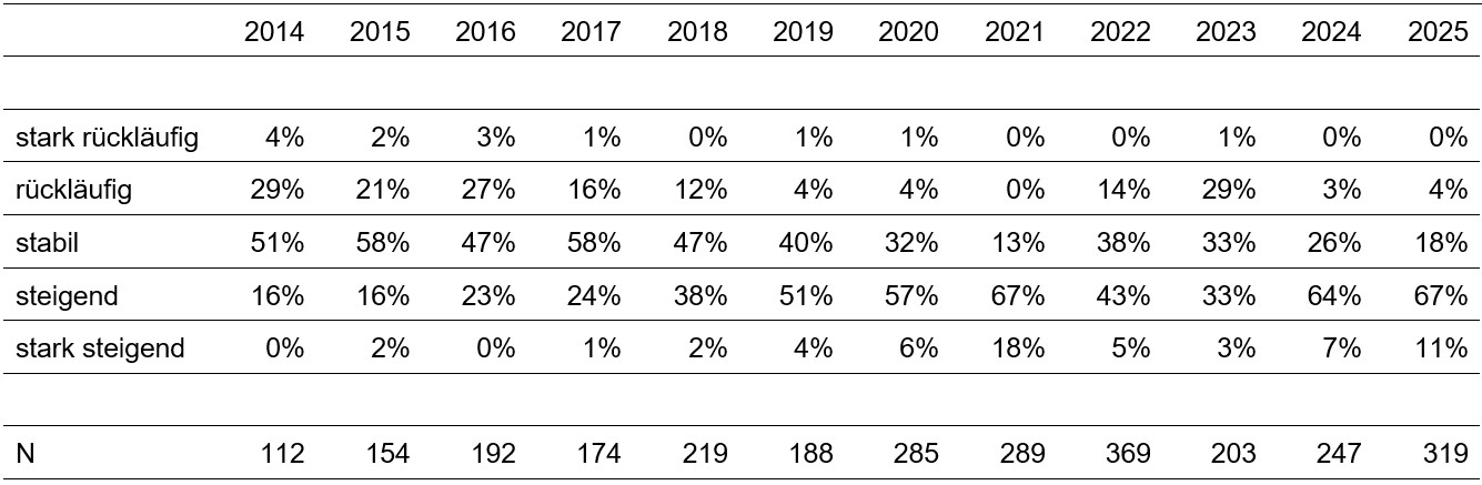 Bei den Mehrfamilienhäusern setzte sich der Trend nach einer höheren Nachfrage fort. Nachdem im Jahr 2023 noch 15,3 Prozent der Experten eine grössere Nachfrage verzeichneten, stieg dieser Wert letztes Jahr auf 28,9 und in diesem Jahr weiter auf 39,0 Prozent. Beim Angebot gab es eine ähnliche Entwicklung, allerdings in die andere Richtung. Im Jahr 2025 verzeichneten noch 13,5 Prozent der Experten ein grösseres Angebot, 2024 lag dieser Wert noch bei 18,2 und 2023 bei 27,4 Prozent und damit doppelt so hoch. Aufgrund dieser Entwicklung überrascht es nicht, dass aktuell 64 Prozent der Experten steigende bis stark steigende Preisen verzeichneten, nachdem dieser Wert mit 46 Prozent im Vorjahr und mit 23 Prozent im Jahr 2023 noch deutlich tiefer war.