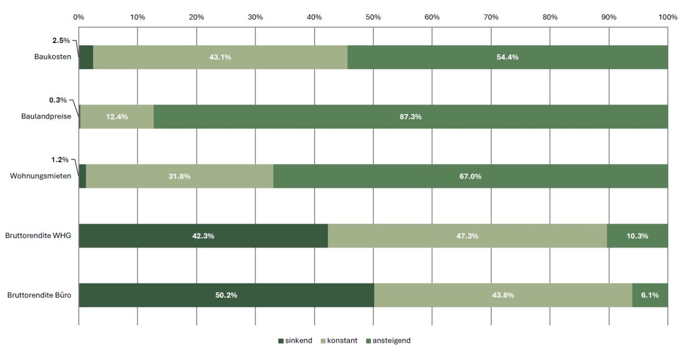 Bei den Baukosten erwartet eine Mehrheit von 54,4 Prozent ansteigende, 43,1 Prozent konstante und nur 2,5 Prozent sinkende Preise. Bei den Baulandpreisen prognostizieren sogar 87,3 Prozent ansteigende und nur 12,4 Prozent konstante bzw. 0,3 Prozent sinkende Preise. Auch bei den Mietzinsen gehen die meisten Experten von steigenden Wohnungsmieten aus, 67,0 Prozent erwarten steigende, 31,8 konstante und 1,2 Prozent sinkende Mieten. Bei den Renditen von Mietwohnungen erwarten 42,3 Prozent sinkende, 47,3 Prozent konstante und 10,3 Prozent ansteigende Bruttorenditen. Ein ähnliches Bild zeigt sich bei Geschäftsflächen, dort erwarten 50,2 Prozent sinkende, 43,8 Prozent konstante und 6,1 Prozent steigende Bruttorenditen.