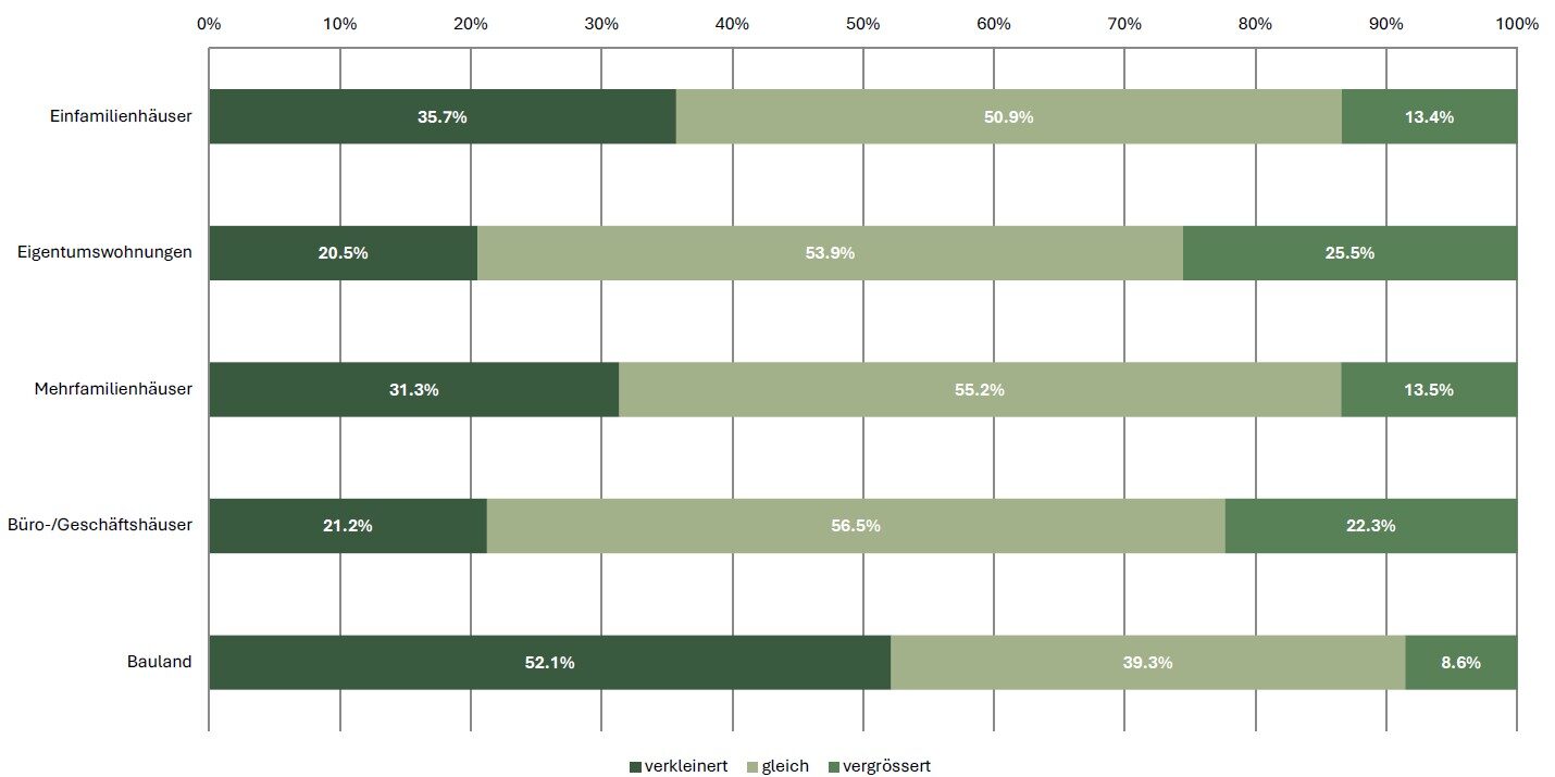 In den vergangenen zwölf Monaten ist die Nachfrage nach Einfamilienhäusern, Eigentumswohnungen und Mehrfamilienhäusern weiter gestiegen, während sich das Angebot insbesondere bei Einfamilienhäusern nochmals deutlich verkleinerte. Besonders ausgeprägt ist die Diskrepanz zwischen Angebot und Nachfrage beim Bauland, was die Baulandpreise entsprechend erhöht. Auch bei Mehrfamilienhäusern liegt die Nachfrage deutlich über der Nachfrage, was zu höheren Preisen und tieferen Renditen führt. Ein anderes Bild zeigt sich bei Büro- und Geschäftsliegenschaften, die Nachfrage ist tief und der Markt von Unsicherheit geprägt.