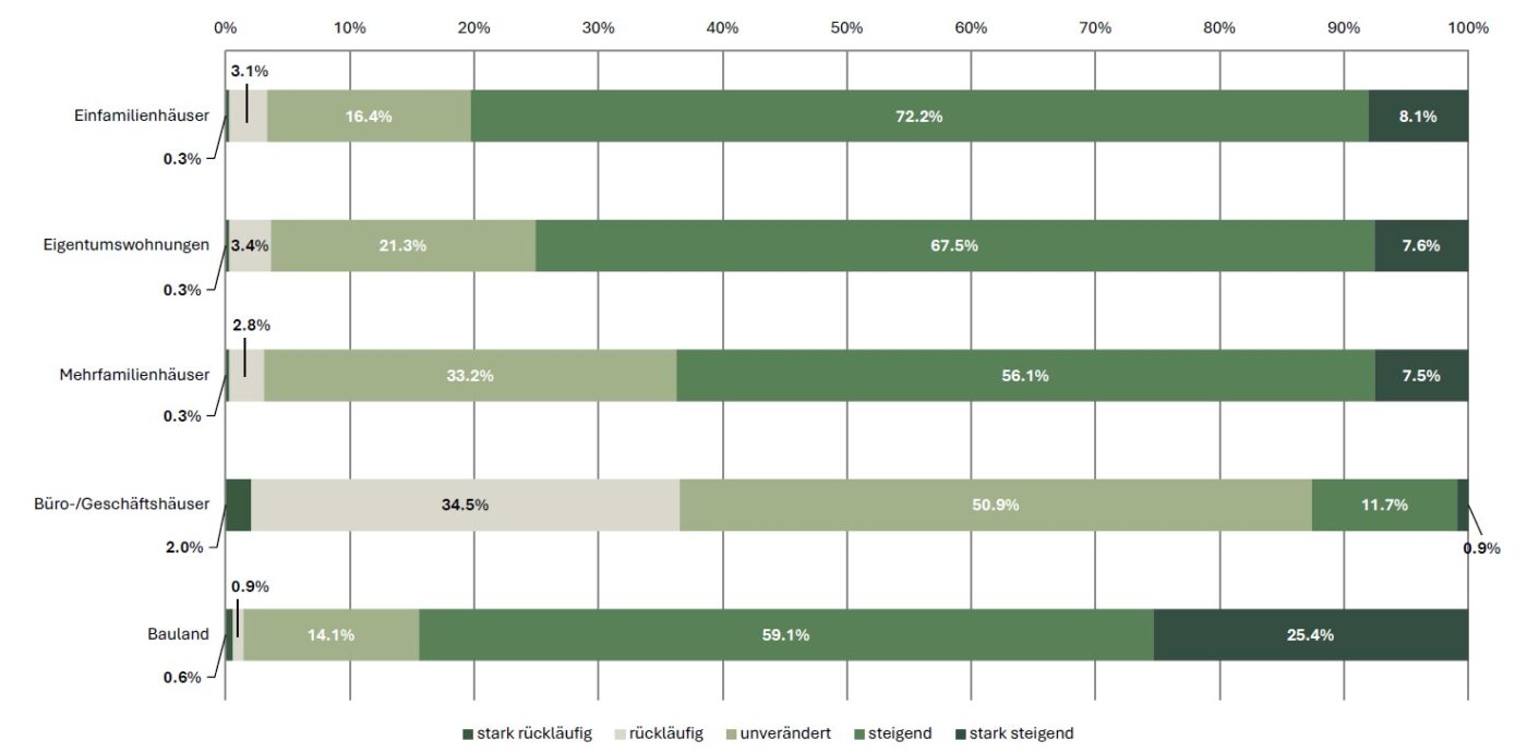Die Experten sind sich einig: Die Preise für Wohnliegenschaften werden weiter steigen. 78 Prozent erwarten einen weiteren Preisanstieg bei Einfamilienhäusern und 74 Prozent bei Eigentumswohnungen. Bei Mehrfamilienhäusern gehen 66 Prozent davon aus, dass die Preise steigen werden, beim Bauland ist die Erwartung von steigenden Preisen mit 84 Prozent am höchsten. Obwohl bei allen Immobilienkategorien von steigenden Preisen ausgegangen wird, erwartet nur eine Minderheit der befragten Experten stark steigende Preise. Ein anderes Bild zeigt sich bei Büro- und Geschäftshäusern, dort erwarten nur 12 Prozent der Experten steigende Preise, die grosse Mehrheit von 44 Prozent geht von stabilen Preisen aus und 43 Prozent erwarten einen Preisrückgang bei Büro- und Geschäftsliegenschaften.