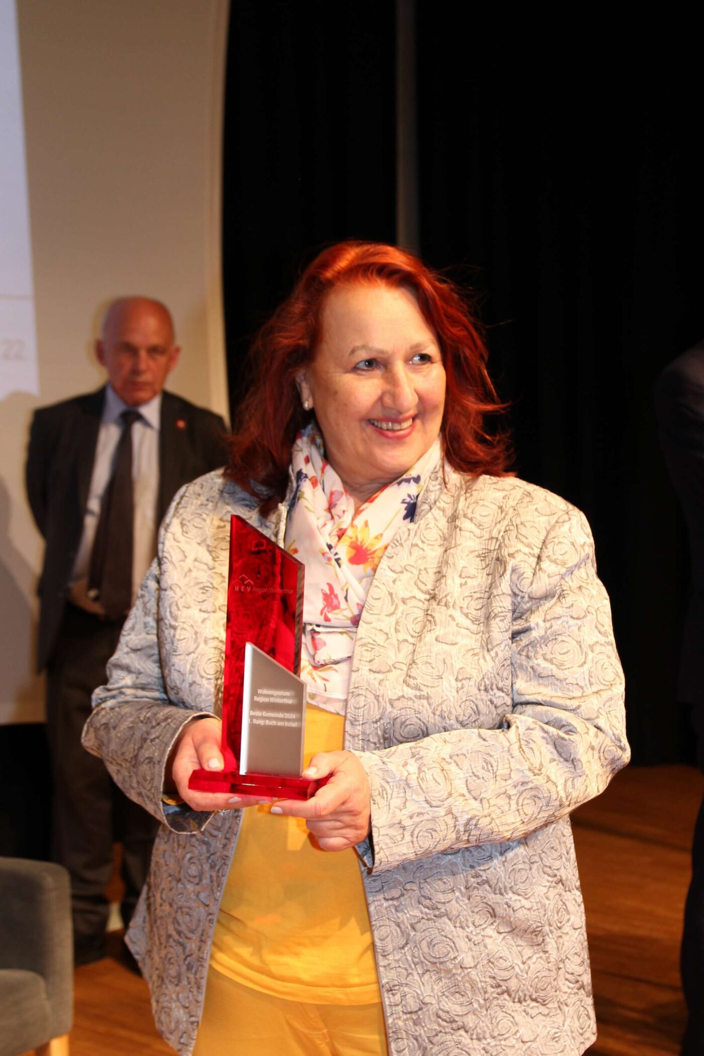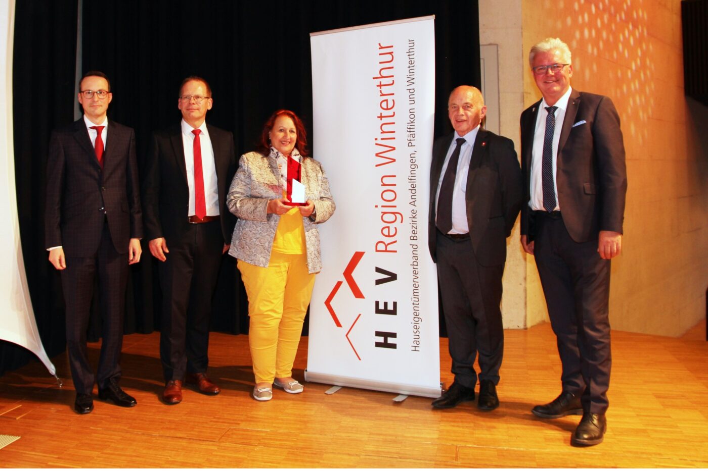 Preisverleihung vom 16. April in Winterthur: Buch am Irchel gewinnt erneut den HEV-Award für gute Rahmenbedingungen beim Wohneigentum. Brigitte Felix nimmt den Preis entgegen.