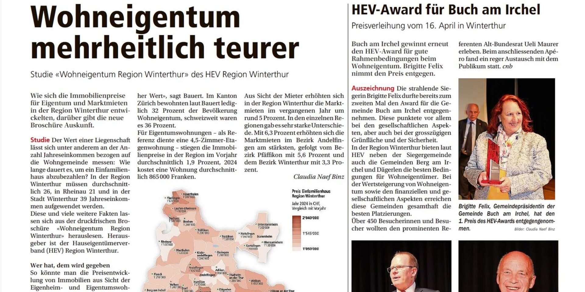 Die Winterthurer Zeitung berichtet in der Ausgabe vom 18. April 2024 über die Immobilienstudie und Veranstaltung "Wohneigentum Region Winterthur" vom HEV Region Winterthur mit der Verleihung des HEV-Awards für die beste Wohneigentumsgemeinde.