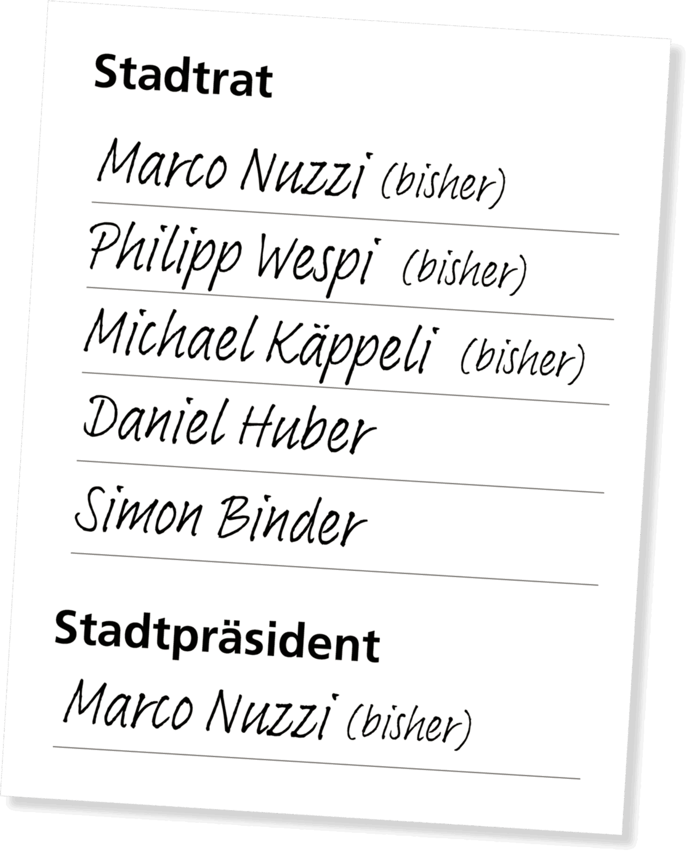 Der Hauseigentümerverband empfiehlt von seinen Mitgliedern Stadtpräsident Marco Nuzzi, die Stadträte Philipp Wespi und Michael Käppeli sowie die Stadtparlamentarier Daniel Huber und Simon Binder zur Wahl in den Stadtrat von Illnau-Effretikon. Als Stadtpräsident wird HEV-Vorstandsmitglied Marco Nuzzi zur Wiederwahl empfohlen.