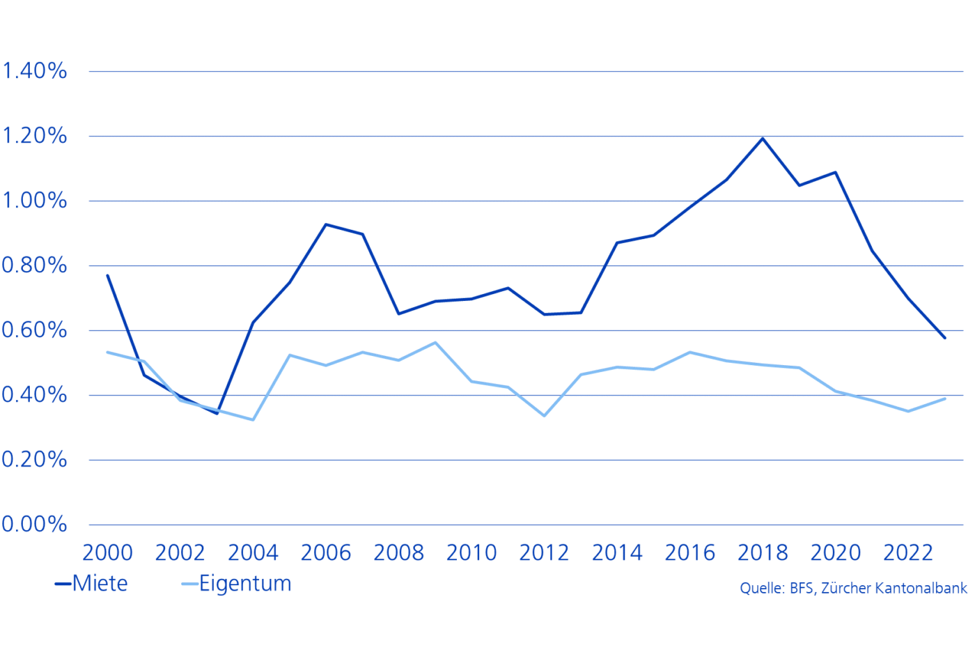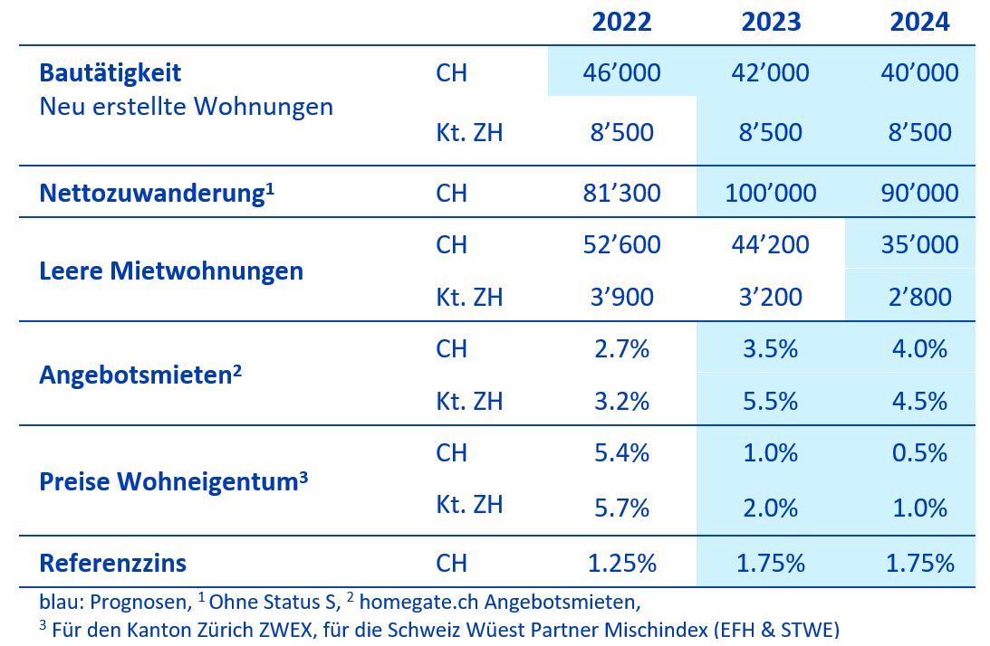Die zunehmende Knappheit am Mietwohnungsmarkt wird auch zukünftig die politischen Diskussionen prägen. Die Anzahl der Mietwohnungen im Bau wird die hohe Nachfrage nach Wohnraum nicht befriedigen können. Der Trend der Anfangsmieten wird somit weiterhin nach oben zeigen. Auch ein grosser Anteil der Bestandesmieter wird mit dem baldigen Anstieg des Referenzzinssatzes mit einer weiteren Mieterhöhung konfrontiert. Beim Wohneigentum ist hingegen der Aufwärtstrend der Eigenheimpreise gebrochen. Eigenheimkäufer, die auf stark fallende Preise hoffen, dürften aber enttäuscht werden. Die Angebote bleiben knapp und schränken den Verhandlungsspielraum bei attraktiven Objekten ein.