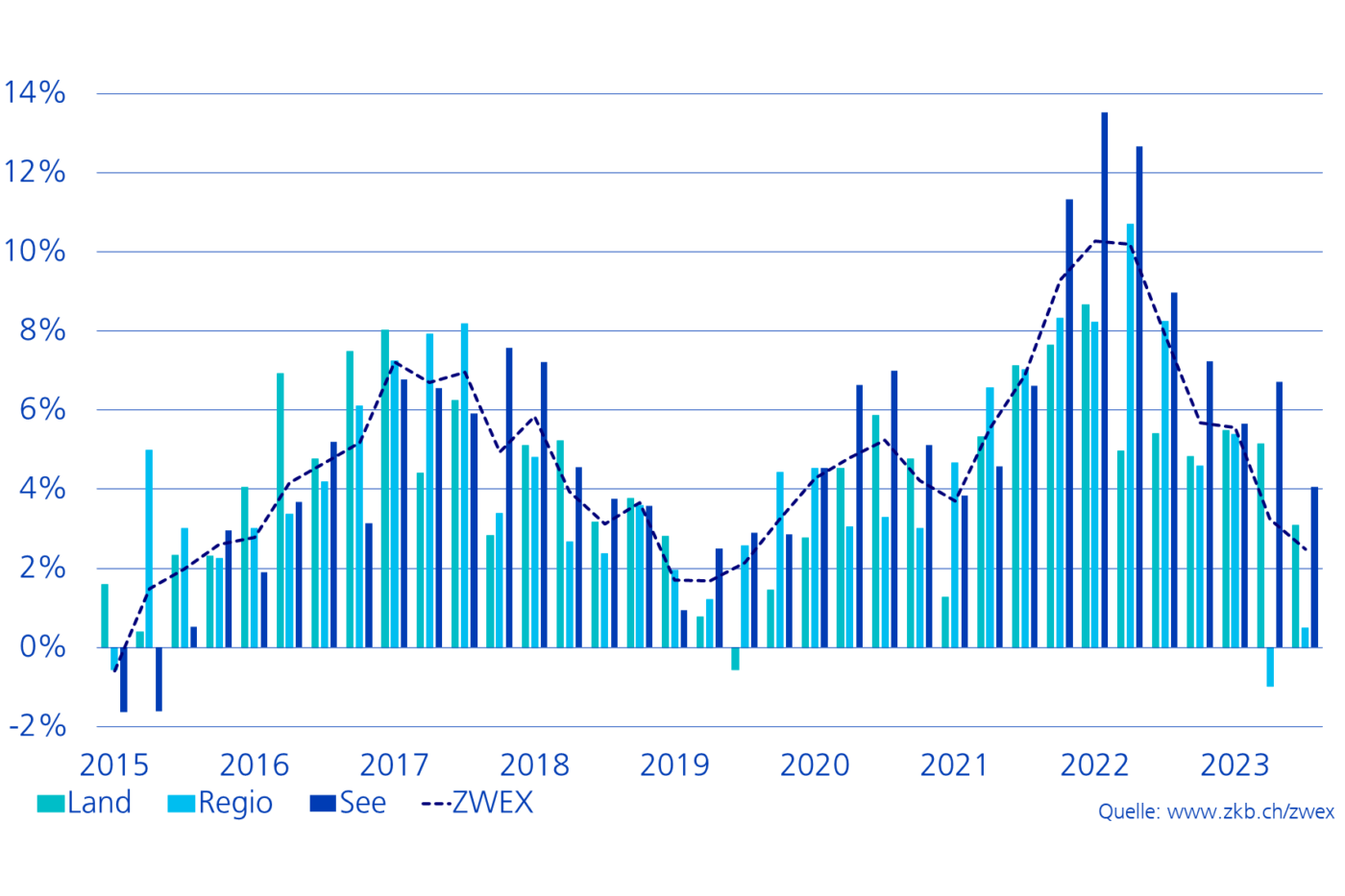 Die Entwicklung des Zürcher Wohneigentumsindex (ZWEX) zeigt im dritten Quartal ein zaghaftes Minus von 0,1 Prozent. Der Rückgang wird durch den Preisrückgang in der Seeregion (–1,8 Prozent) verursacht, welche die Stadt Zürich sowie die Zürcher Seegemeinden umfasst. Damit fand eine Gegenbewegung zu dem in der Seeregion kräftiger als erwarteten Preiswachstum des Vorquartals statt. Das Preiswachstum gegenüber dem Vorjahr befindet sich mit einem Plus von 2,5 Prozent weiterhin auf robustem Niveau. Auch nach dem ersten negativen Vorzeichen seit 2017 ist der Zürcher Eigenheimmarkt weit davon entfernt, dass die Preise breitflächig sinken.