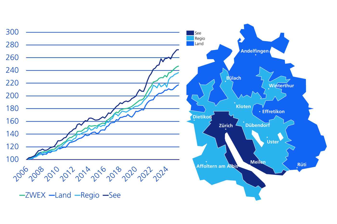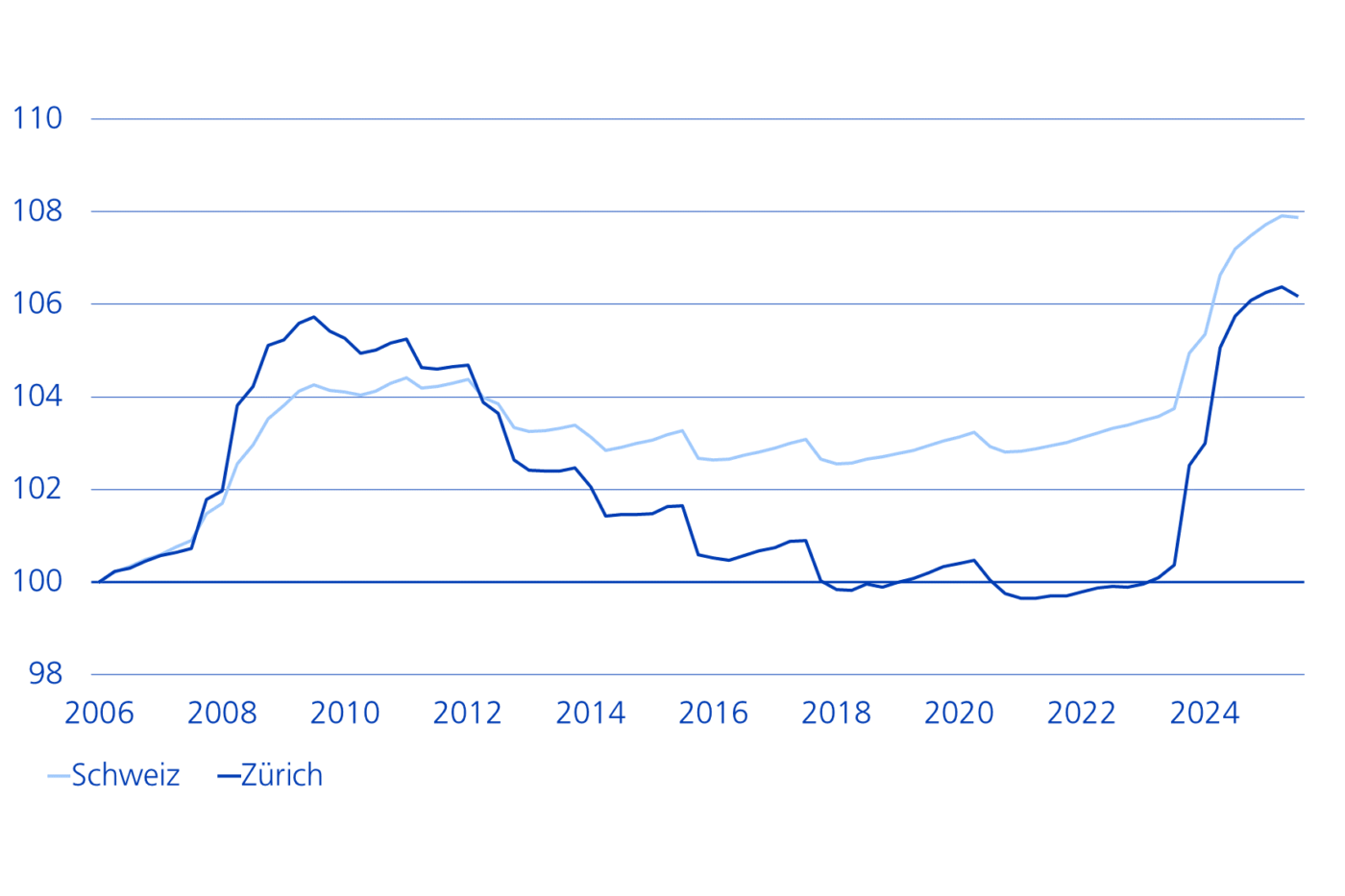 Die Nettozuwanderung dürfte sich 2025 und 2026 aufgrund des geringeren Beschäftigungswachstums gegenüber den Vorjahren deutlich abschwächen. Eine Erhöhung der Anzahl leerstehenden Mietwohnungen und damit verbunden eine Entspannung auf dem Mietmarkt ist kurzfristig jedoch noch nicht zu erwarten. Entsprechend gehen wir auch weiterhin von einem leichten Wachstum der Angebotsmieten aus. Dem Eigenheimmarkt verleihen die günstigen Finanzierungsbedingungen weiter Rückenwind. Schweizweit und im Kanton Zürich erwarten wir für dieses und nächstes Jahr ein Wachstum von 4,5 Prozent.