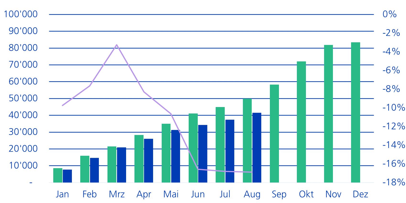Absolute Zahlen (L) und Verhältnis zum Vorjahresmonat (R)