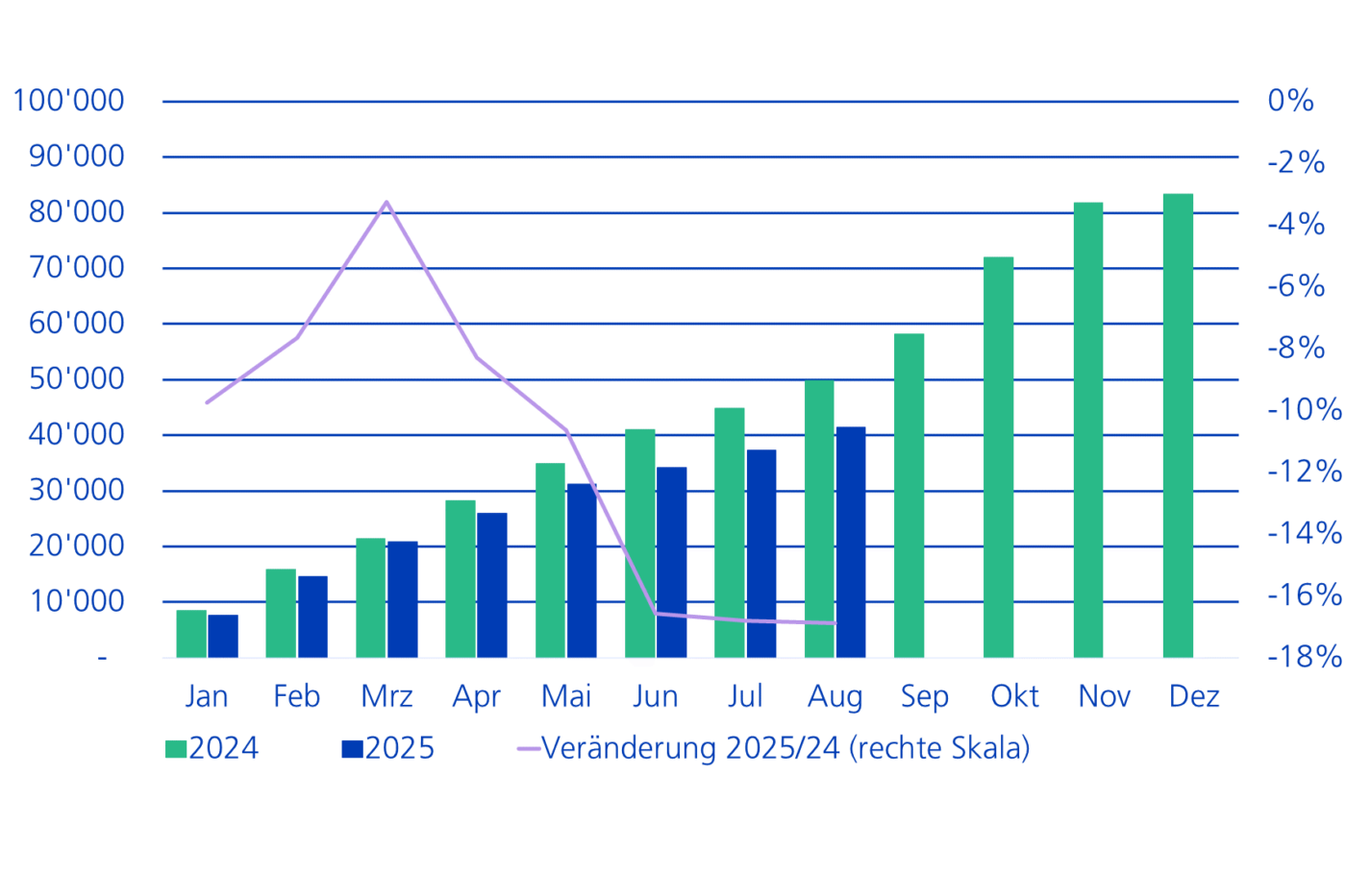 Die Nettozuwanderung fiel 2025 schweizweit bisher um 17 Prozent niedriger aus als im Vorjahr. Insgesamt sind bis August 2025 netto rund 41'400 Personen eingewandert. Zu diesem Zeitpunkt waren es 2024 bereits knapp 50'000 Personen. Ein Hauptgrund für diesen deutlichen Rückgang der Nettozuwanderung ist die steigende Abwanderung. Mit über 68'000 ausgewanderten Personen seit Jahresbeginn liegt sie so hoch wie nie in den letzten 10 Jahren. Die niedrigere Nettozuwanderung, die vor allem den Mietwohnungsmarkt in grossen Städten betrifft, sollte zumindest dazu beitragen, dass sich die Wohnraumknappheit dort nicht weiter verschärft.