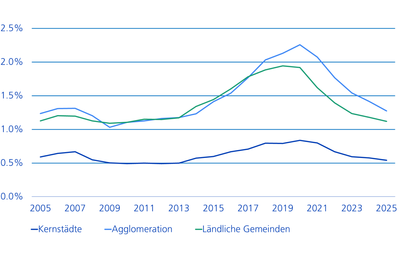 In der Agglomeration und ländlichen Gebieten hat der Leerwohnungsbestand nach einer gewissen Erholung um 2020 nun wieder seinen langjährigen Minimalwert von rund 1 Prozent erreicht. Auch in den Kernstädten liegt die Leerstandsquote mit 0,5 Prozent wieder beim langjährigen Minimum, wobei sich da die Situation über die vergangenen Jahre kaum je entspannt hatte. Auch bei sehr ausgeprägter Knappheit wird stets ein gewisser Bestand an Leerwohnungen bestehen bleiben. Diese Untergrenze reflektiert etwa Verzögerungen bei Neuvermietungen oder ein Bestand an schwer zu vermittelnden Objekten – die Ladenhüter im Wohnungsangebot.