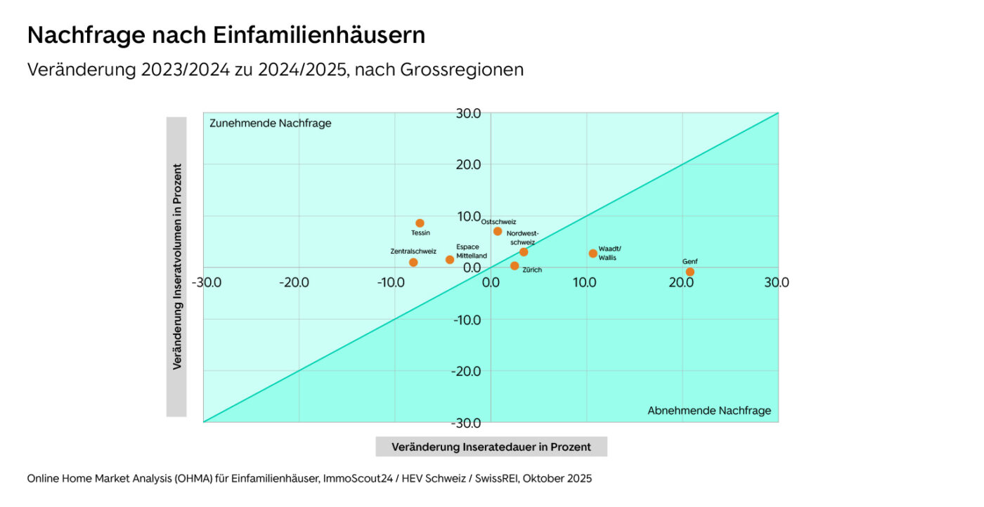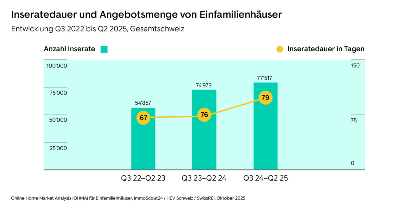 Die Online Home Market Analysis (OHMA) des Immobilienportals ImmoScout24 in Zusammenarbeit mit dem Hauseigentümerverband Schweiz (HEV) sowie dem Swiss Real Estate Institute (SwissREI) analysiert die online inserierten Einfamilienhäuser in der Schweiz. Der Zeitraum umfasst Juli 2024 bis Juni 2025. Die Daten stammen von den führenden Immobilienportalen und erlauben Rückschlüsse auf die Marktentwicklung.