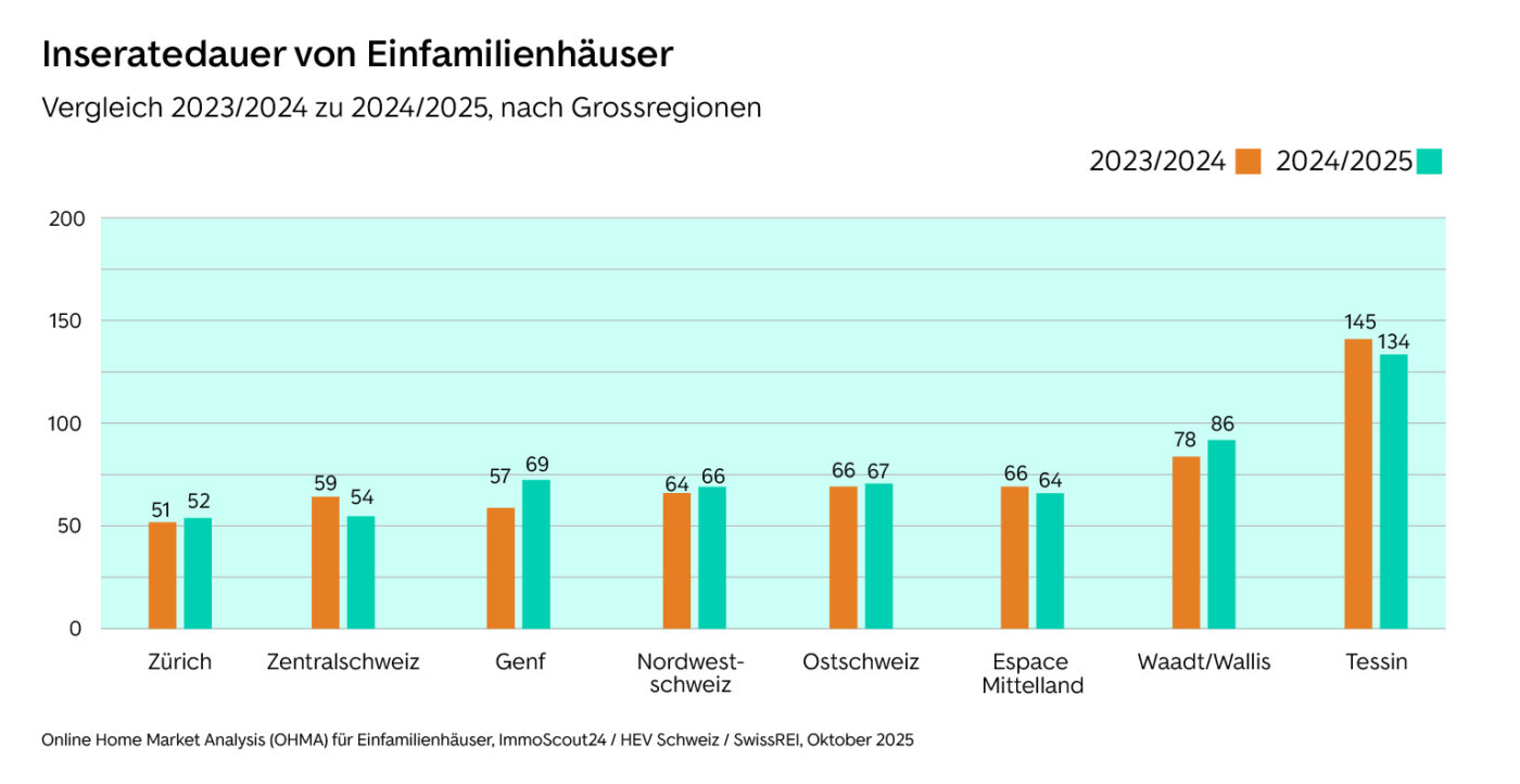 Lesebeispiel: Im Tessin dauerte es im Zeitraum Mitte 2023 bis Mitte 2024 im Schnitt 145 Tage, bis ein Einfamilienhaus verkauft war, im Folgejahr noch 134 Tage (farbige Balken rechts).