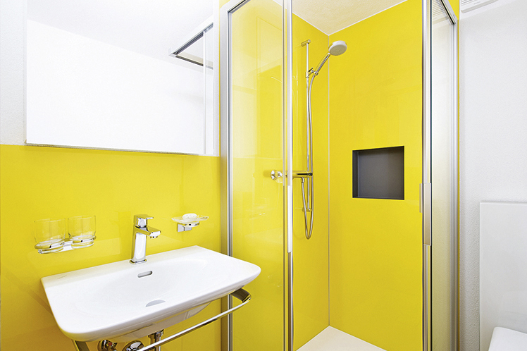 Anschliessend beginnt die rutschfreie Zone. Rutschhemmende Materialien (Anti-Slip) minimieren ein wesentliches Risiko in Nassbereichen. Anti-Slip ist ein glasfaserverstärkter Verbundwerkstoff, der die hervorragenden mechanischen Eigenschaften und die Widerstandsfähigkeit glasfaserverstärkter Verbundstoffe mit einer effektiven, abriebbeständigen Anti-Rutsch-Beschichtung kombiniert. Bei der Bodenwahl sollten pflege- und wartungsarme Oberflächen berücksichtigt werden. Je weniger Fugen vorhanden sind, desto geringer ist der Reinigungsaufwand.