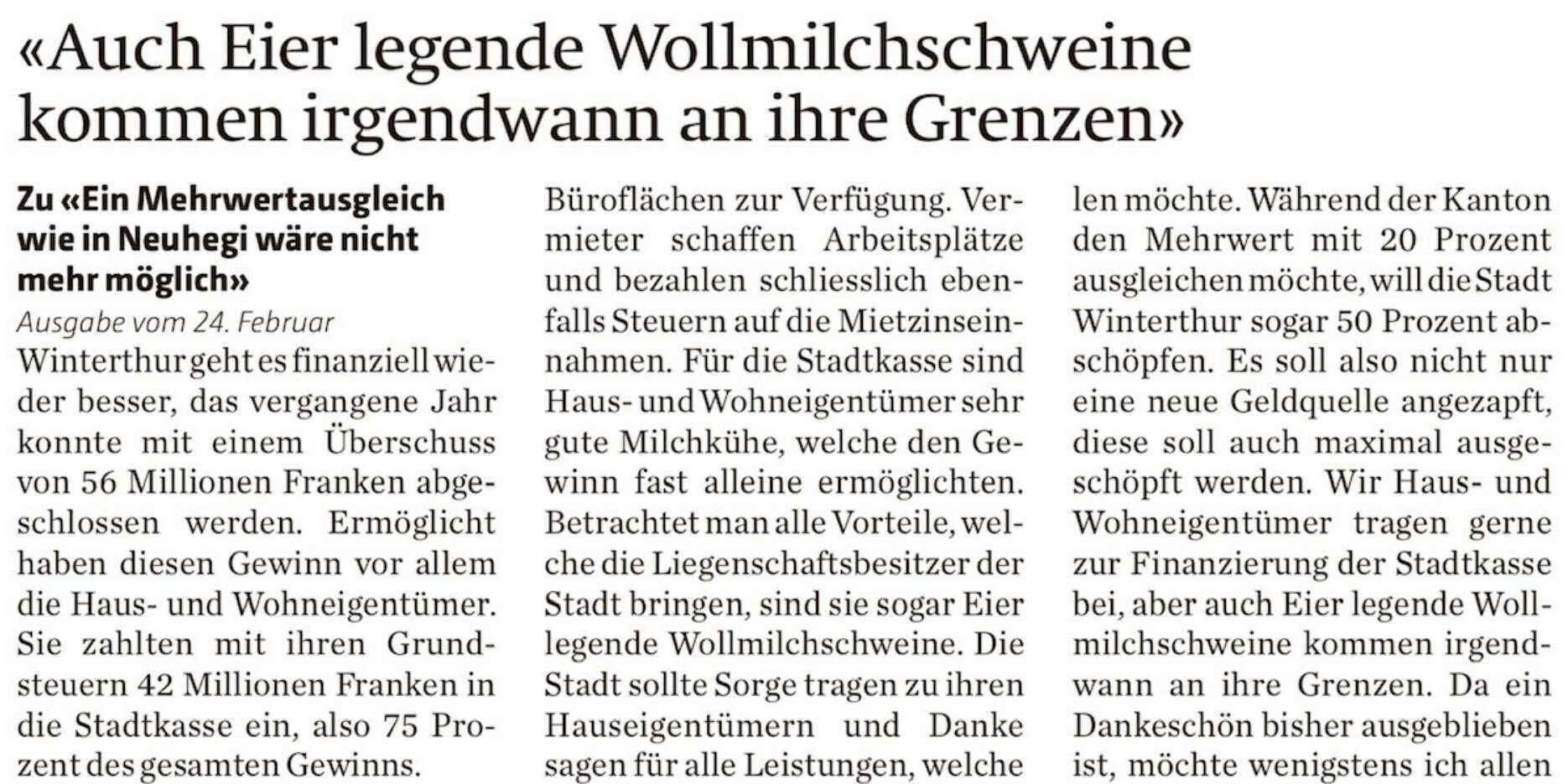 Für die Stadtkasse sind Haus- und Wohneigentümer sehr gute Milchkühe, welche den Gewinn fast alleine ermöglichten. Betrachtet man alle Vorteile, welche die Liegenschaftsbesitzer der Stadt bringen, sind sie sogar eierlegende Wollmilchschweine. Die Stadt sollte Sorge tragen zu ihren Hauseigentümern und danke sagen, für alle Leistungen welche jedes Jahr für Winterthur erbracht werden.