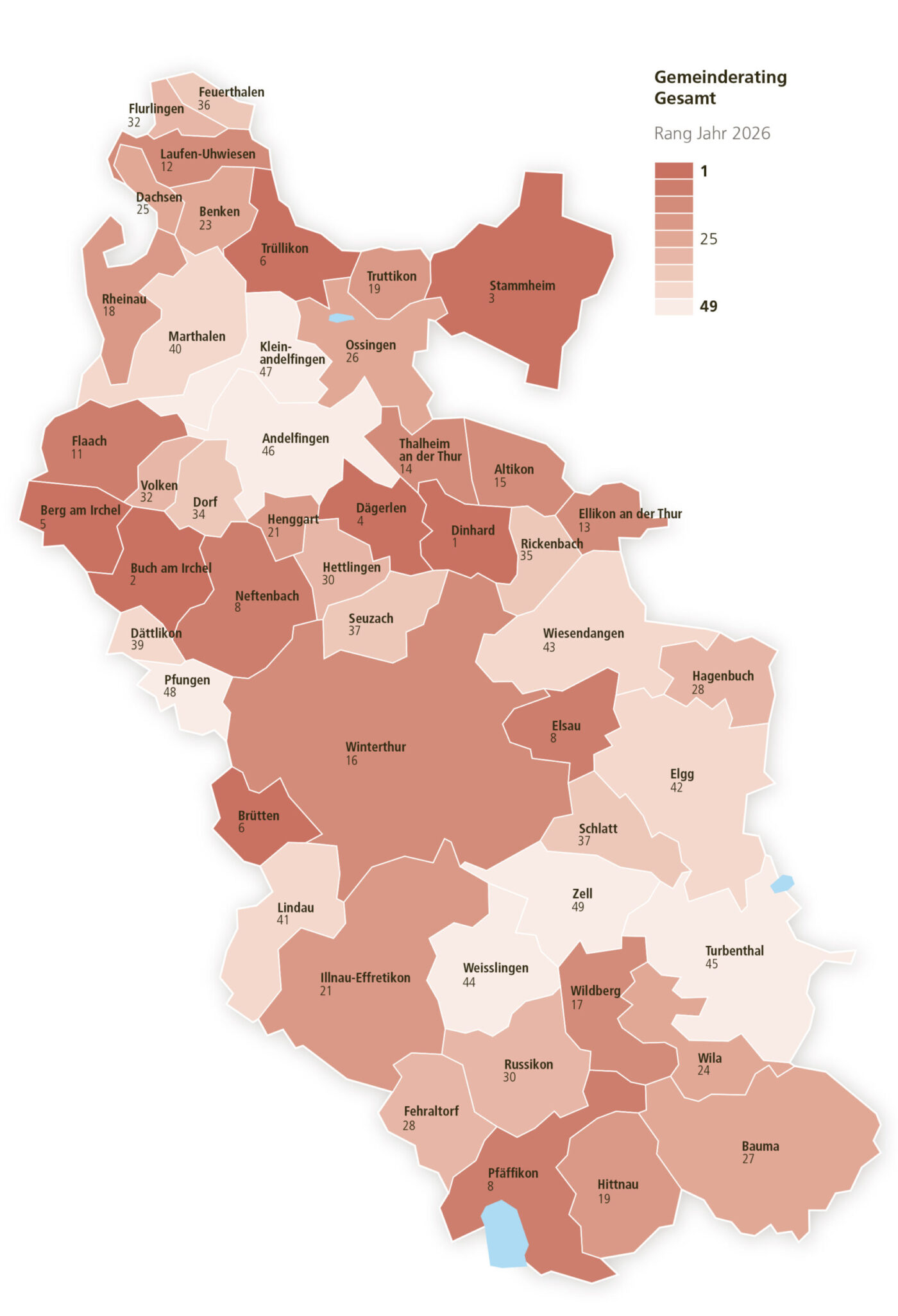 Mit den Ergebnissen der Wohneigentumsstudie wurde die Attraktivität aller Gemeinden im Zusammenhang mit Wohneigentum ausgewertet. Für die Auswertung wurden die Entwicklung der Immobilienpreise sowie die finanziellen und gesellschaftlichen Aspekte der Gemeinden berücksichtigt. Gesamthaft bieten Dinhard, Buch am Irchel und Stammheim die besten Rahmenbedingungen für Wohneigentum.