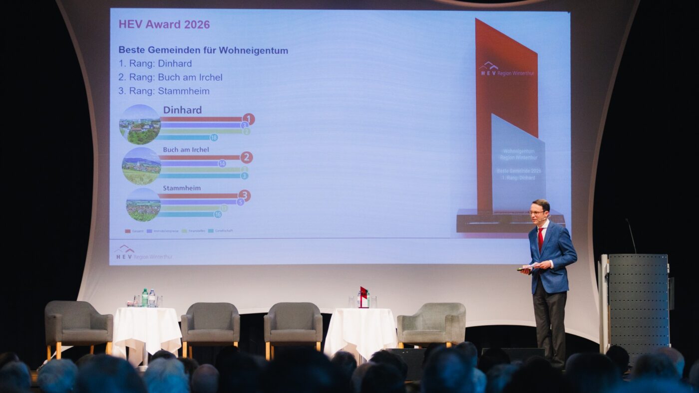 Bei der Veranstaltung «Wohneigentum Region Winterthur 2026» präsentierte HEV-Geschäftsführer Ralph Bauert die neuste HEV-Studie zum Immobilienmarkt der Region Winterthur und wie sich die Preise von Einfamilienhäusern und Eigentumswohnungen entwickelten. HEV-Präsident Matthias Baumberger übergab dem Gemeindepräsident von Dinhard den HEV-Award für die beste Wohneigentumsgemeinde. Was Hauseigentümerinnen und Hauseigentümer bei Heizungsersatz und Photovoltaik beachten sollten wurden von zwei Fachexperten aufgezeigt.