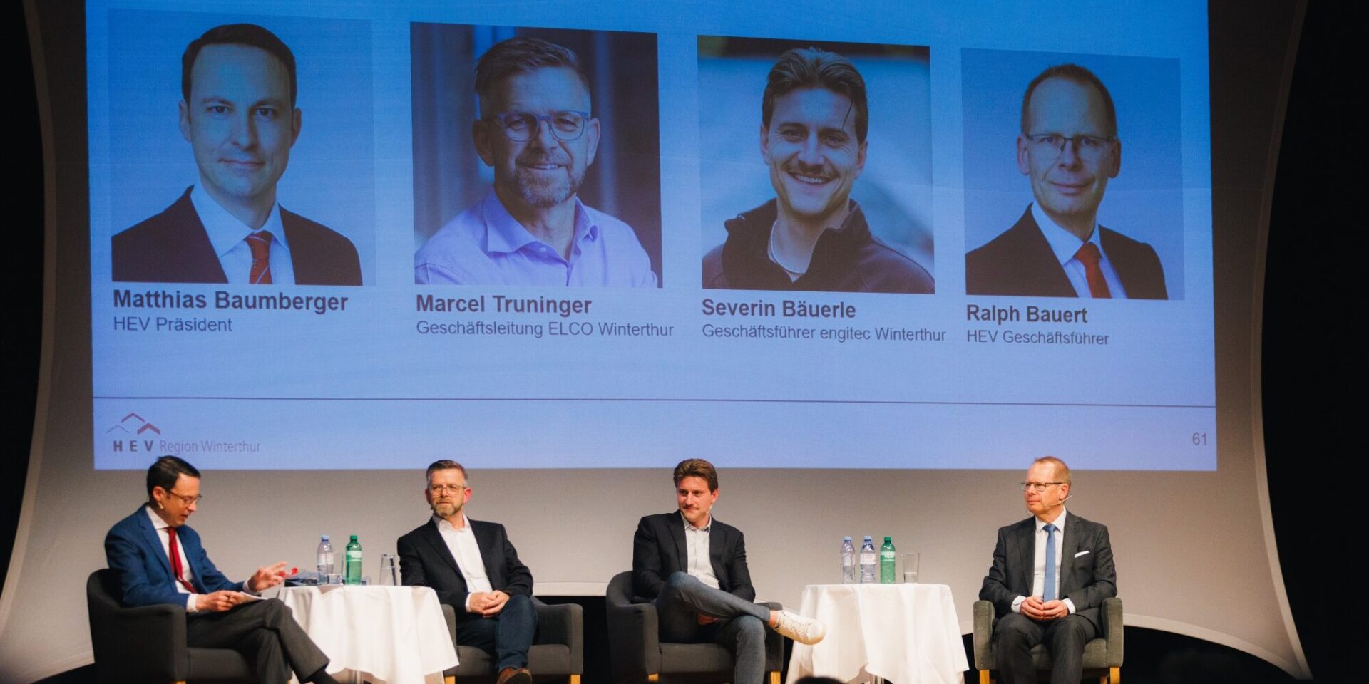 HEV-Veranstaltung «Wohneigentum Region Winterthur 2026» (von links): HEV-Präsident Matthias Baumberger, Elco-Geschäftsleitungsmitglied Marcel Truninger, Gemeindepräsident Dinhard Thomas Schmid, Engitec-Geschäftsführer Severin Bäuerle, HEV-Geschäftsführer Ralph Bauert.