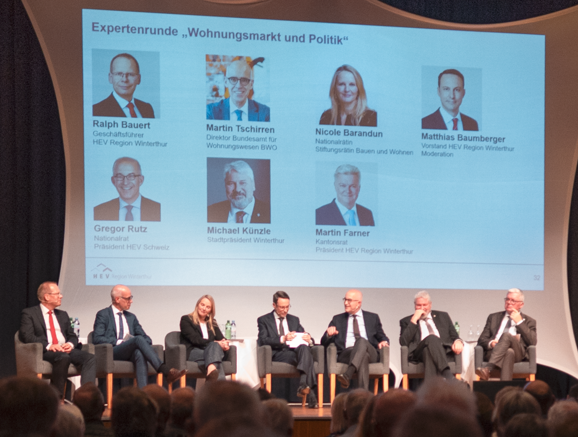 Bei der Expertenrunde diskutierten BWO-Direktor Martin Tschirren, Nationalrat Gregor Rutz, Nationalrätin Nicole Barandun, der Winterthurer Stadtpräsident Michale Künzle, HEV-Präsident und Kantonsrat Martin Farner sowie HEV-Geschäftsführer Ralph Bauert die Möglichkeiten der Politik beim Wohnungsmarkt. Moderator Matthias Baumberger wollte von Martin Farner und Michael Künzle wissen, wie sich die ländlichen Regionen und die Städte beim Wohnungsmarkt ergänzen können und welche Auswirkungen eine Annahme der Initiative «Wohnen für alle» auf den Winterthurer Wohnungsmarkt hätte.