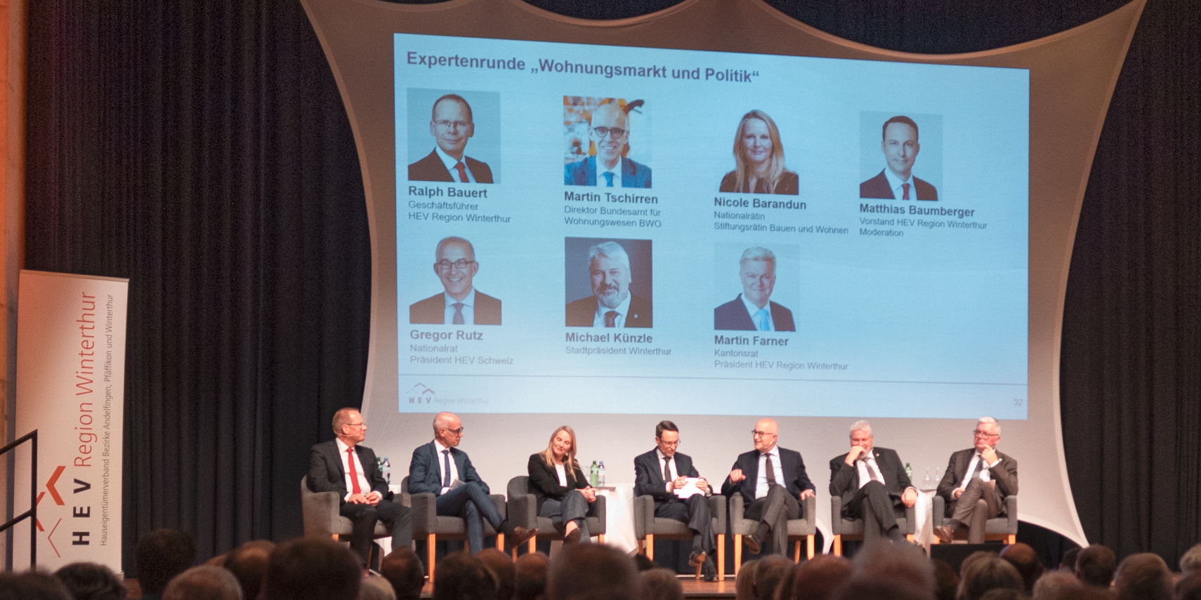Bei der Expertenrunde diskutierten BWO-Direktor Martin Tschirren, Nationalrat Gregor Rutz, Nationalrätin Nicole Barandun, der Winterthurer Stadtpräsident Michale Künzle, HEV-Präsident und Kantonsrat Martin Farner sowie HEV-Geschäftsführer Ralph Bauert die Möglichkeiten der Politik beim Wohnungsmarkt. Moderator Matthias Baumberger wollte von Martin Farner und Michael Künzle wissen, wie sich die ländlichen Regionen und die Städte beim Wohnungsmarkt ergänzen können und welche Auswirkungen eine Annahme der Initiative «Wohnen für alle» auf den Winterthurer Wohnungsmarkt hätte.