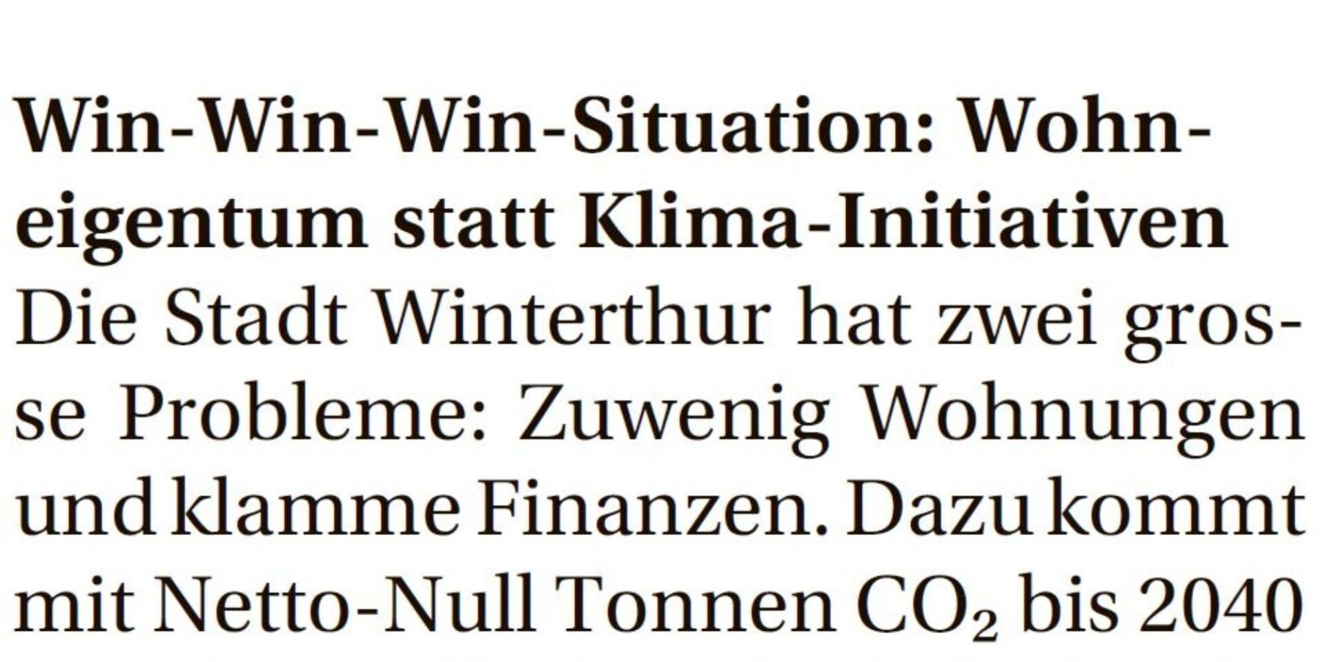 Die Stadt Winterthur hat zwei grosse Probleme: Zuwenig Wohnungen und klamme Finanzen. Dazu kommt mit Netto-Null Tonnen CO2 bis 2040 eine herausfordernde Aufgabe dazu. Beide Probleme und die Aufgabe werden durch die Klima-Initiativen nicht gelöst.