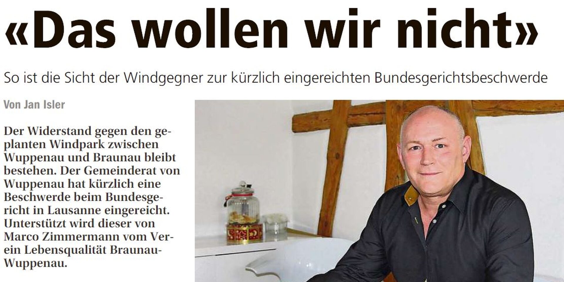 Der Gemeinderat von Wuppenau TG hat beim Bundesgericht Beschwerde gegen den geplanten Windpark zwischen Wuppenau und Braunau eingereicht. Der Kanton will die Ortsplanung der Gemeinde nicht genehmigen. Der Verein "Lebensqualität Braunau-Wuppenau" zitiert in den Wiler Nachrichten die Analyse zum Werteinfluss von Windturbinen auf den Immobilienwert vom HEV Region Winterthur.