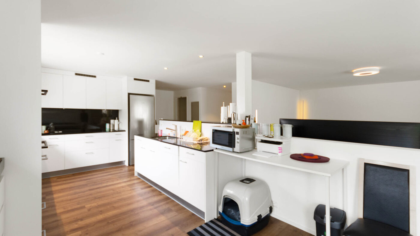 - Moderne Küche mit Kücheninsel, Backofen, Steamer, Lavabo, Kühlschrank und Tiefkühler, alle Geräte von V-Zug und vielen Schränken