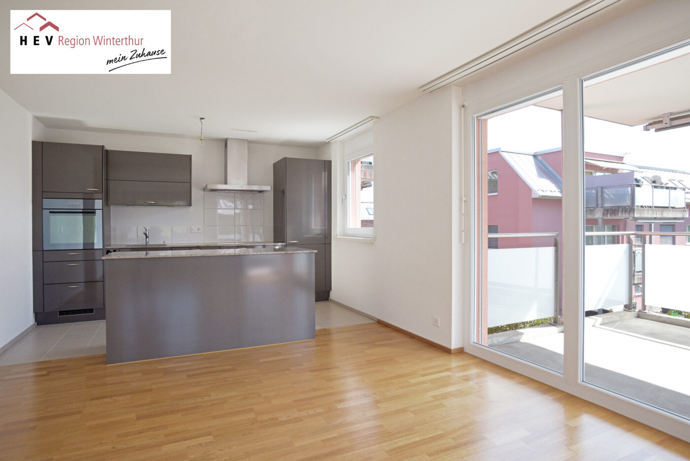 Dahinter öffnet sich der helle und freundliche Wohn- und Essbereich. Von hier aus haben Sie einen direkten Zugang zum gut besonnten Balkon mit wunderbarem Weitblick. Die moderne Küche mit Kochinsel lässt das Herz jedes Hobbykochs höher schlagen und ist perfekt ins Raumkonzept integriert, dabei zoniert die grosse Kochinsel gekonnt den Wohn- und Essbereich.