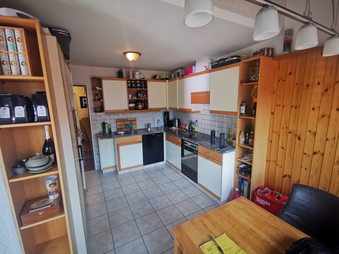 Das Mietobjekt ist auf zwei Etagen verteilt. Nach dem Entrée betritt man die Wohnung durch den Hauptkorridor, von dem man die Küche, Wohnzimmer und beiden anderen Zimmer erreichen kann. Das Wohnzimmer mit Cheminée ist lichtdurchflutet und lädt zum Verweilen ein. Die Küche ist mit einem Kochherd, Dampfabzug, Geschirrspüler, Kühlschrank, Backofen und vielen Schränken gut ausgestattet. Eine Sitzgelegenheit rundet es ab. Von hier aus gelangt man auf den geräumigen Balkon, mit einer schönen Aussicht auf das Umland.