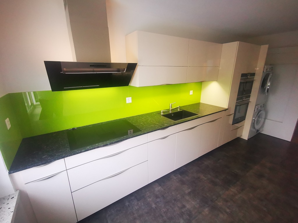 Die Küche ist gross gestaltet und enthält einen Backofen, Steamer, Geschirrspüler, Induktionsherd, Kühlschrank mit Tiefkühler und viele Schränke. Eine Waschmaschine und Tumbler befindet sich auch dort. Zudem hat ein Tisch mit Stühlen Platz.
