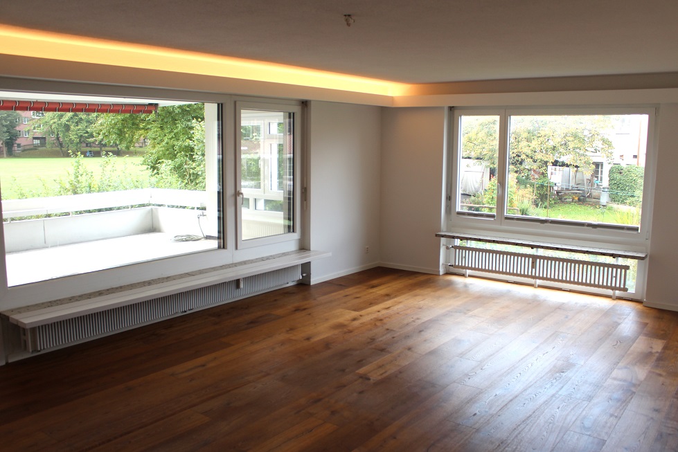 Vom Korridor aus kommt man in das geräumige Wohnzimmer, welches zum Verweilen einlädt. Von hier aus gelangt man zur fast 40 m2 grossen Terrasse. Die anderen vier Zimmer sind grosszügig geschnitten. Von zweien aus kommt man zum kleineren Balkon, der zur Strasse hin gebaut ist. In den Zimmern ist ein hochwertiger Parkettboden verlegt.