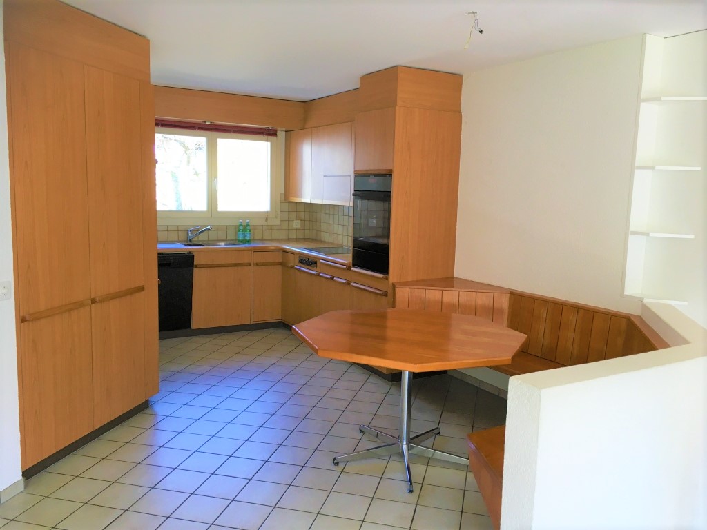 Die Wohnküche wird mit einer Eckbank und einem grossen Tisch ergänzt, Backofen in Sichthöhe, Glaskeramikherd, Geschirrspüler, ein grosser Wandschrank und ein grosser Kühlschrank. Neben der Wohnküche besteht ein Reduit mit Waschturm und Tablaren.