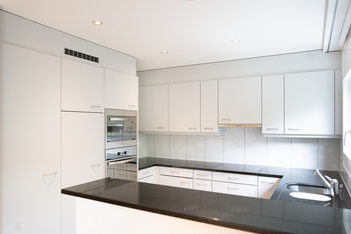Die Wohnung zeichnet sich aus durch einen modernen, offenen Grundriss. Das helle, grosszügige Wohnzimmer besitzt grosse Fenster und lädt zum gemütlichen Beisammensein ein. Daneben befindet sich die offene Küche mit Induktionskochherd, Backofen, Mikrowelle, Kühlschrank, Lavabo, Geschirrspüler, Abstellfläche aus Granit, Theke mit Granitoberfläche und viele Schränke. Daneben befindet sich ein Reduit als zusätzlicher Stauraum.