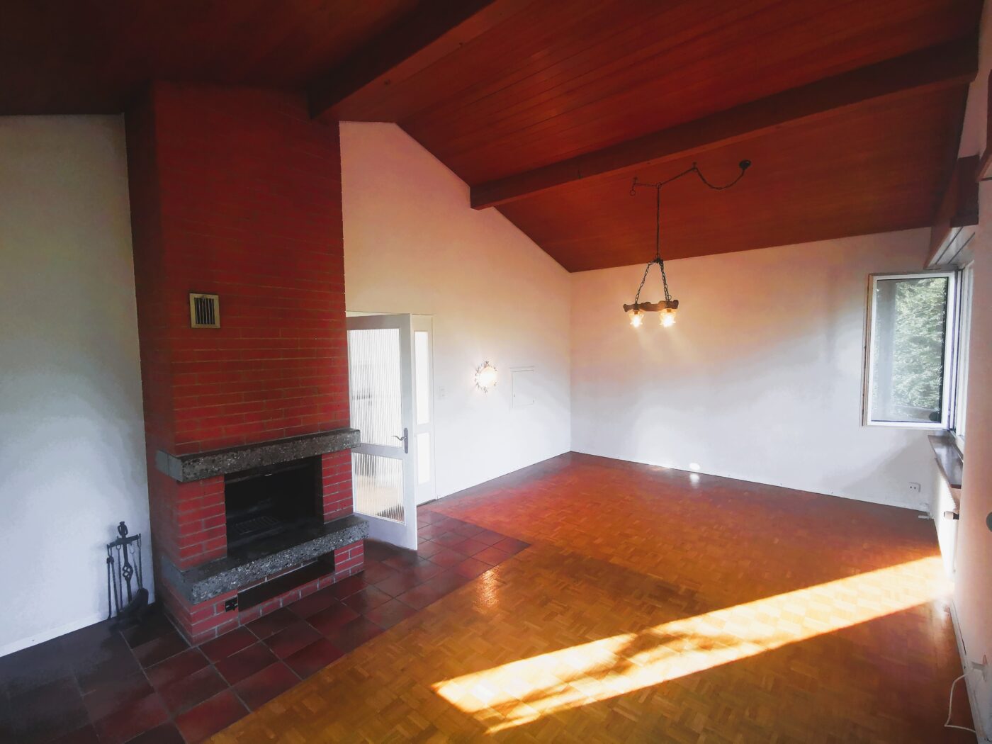Über die Treppe erreicht man den Hauseingang mit grossem Vorplatz und Eingangsbereich. Von hier aus gelangt man rechts in das grosse Wohnzimmer, geradeaus in die Küche und links in das Bad und die übrigen Zimmer. Das grosse Wohnzimmer hat einen grossen Cheminée und eine breite Fensterfront. Von hier aus kommt man zum grossen Balkon.