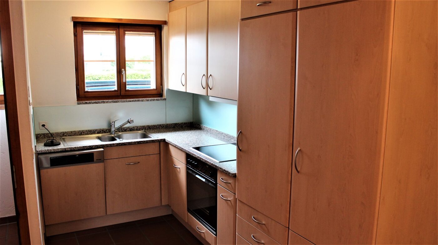Vom Entrée aus gelangt man direkt in die Küche. Diese besitzt einen Kochherd mit Dampfabzug, Backofen mit integrierter Mikrowelle, Geschirrspüler, Lavabo, Kühlschrank und Schränke mit Schubladen. Anschliessend an die Küche kommt man zum Treppenhaus, von welchem man alle Zimmer erreichen kann.