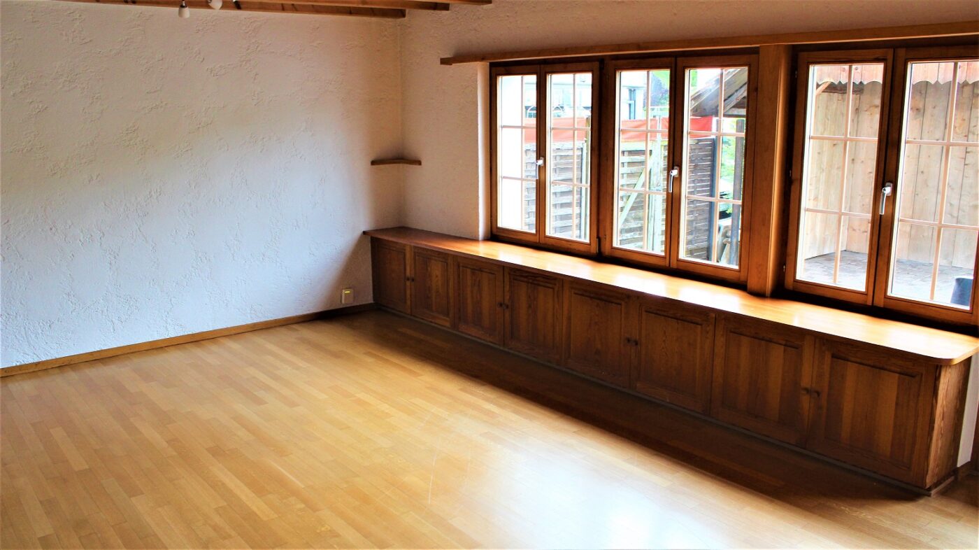 Das grosse lichtdurchflutete Wohnzimmer hat eine breite Fensterfront und besitzt einen Kachelofen mit Ofensitzplatz. Vom Wohnzimmer aus gelangt man in den grossen Garten mit einer Pergola und einem Schopf für die Gartengeräte. Für Grillabende ist der Garten hervorragend geeignet.