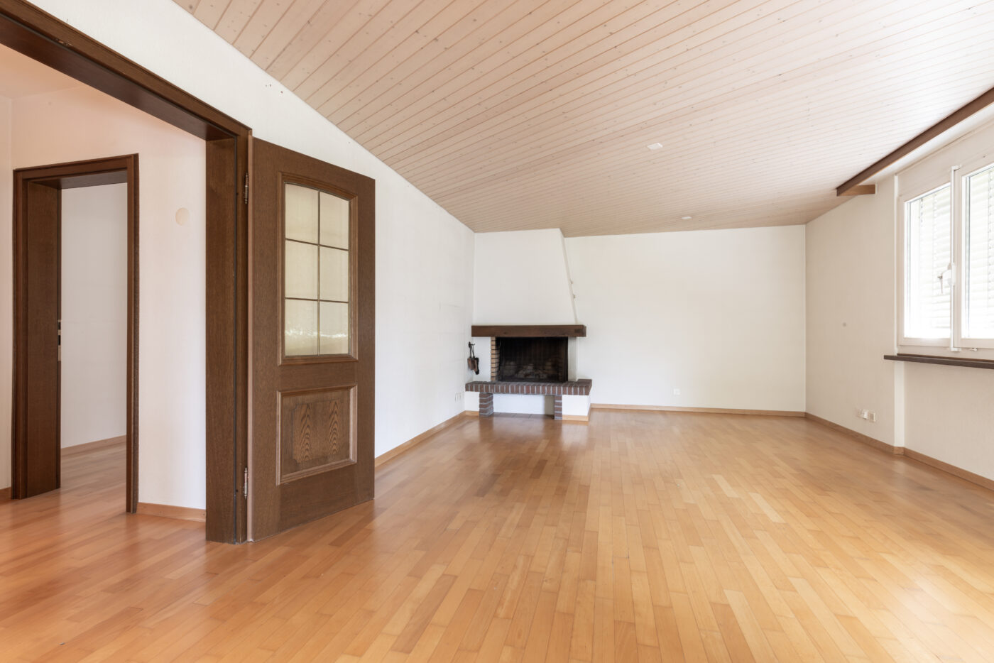 Am Ende des Korridors befindet sich der Wohn- und Essbereich. Das Wohnzimmer hat ein grosses Fenster und bietet einen Blick ins Grüne. Vom Essbereich aus geniesst man ebenfalls den Blick auf die Terrasse und das Grün der Wohnanlage.